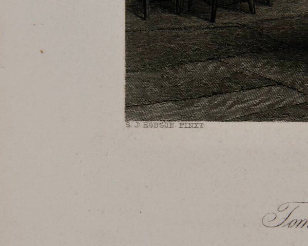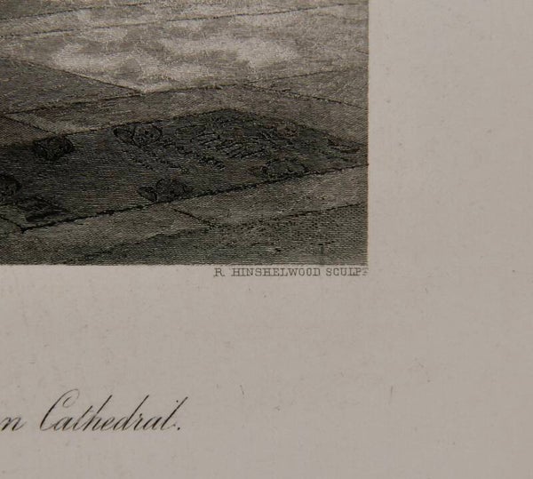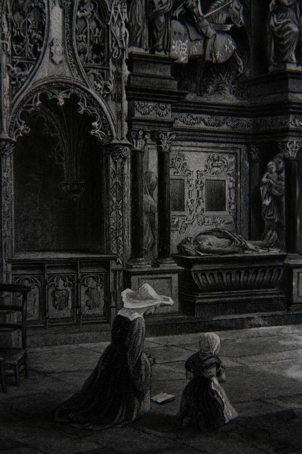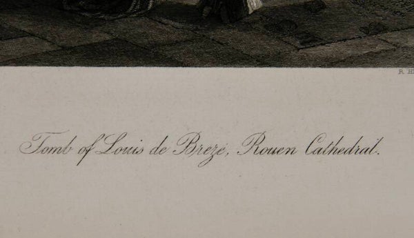 This 19th-century steel engraving "Tomb of Louis de Brézé, Rouen Cathedral" after S. H. Hodson and engraved by R. Hinshelwood depicts a detailed rendering of the tomb situated within Rouen Cathedral. It depicts intricate architectural details of the cathedral's interior, with a focus on the grandeur and solemnity of the tomb of Louis de Brézé. The engraving captures the ornate features of the tomb, including sculptures, inscriptions, and other decorative elements, all rendered with precision and delicacy characteristic of steel engravings from that era. The composition showcases a mother and her young daughter paying their respects which conveys a sense of reverence and historical significance associated with the burial site of Louis de Brézé within this iconic cathedral.