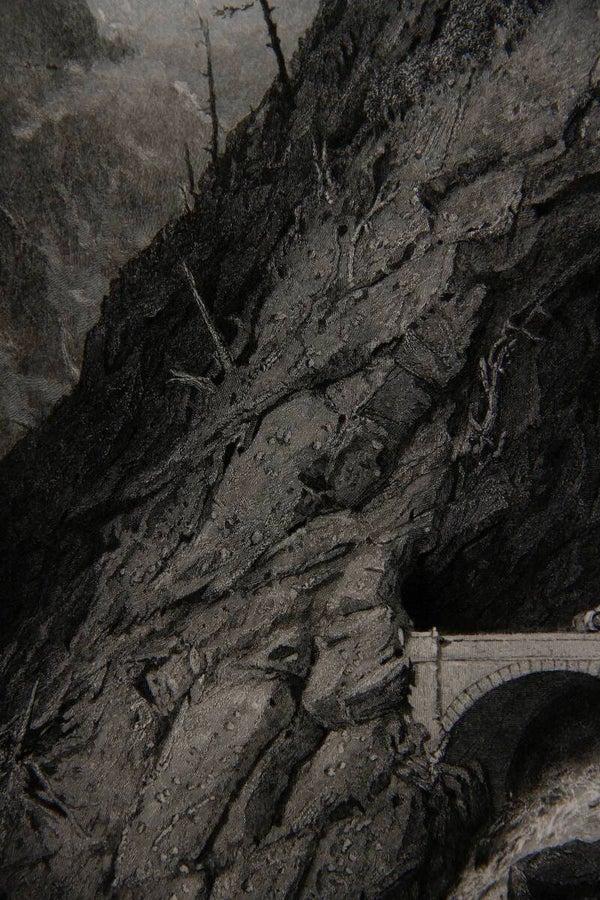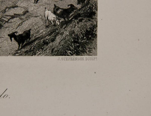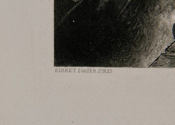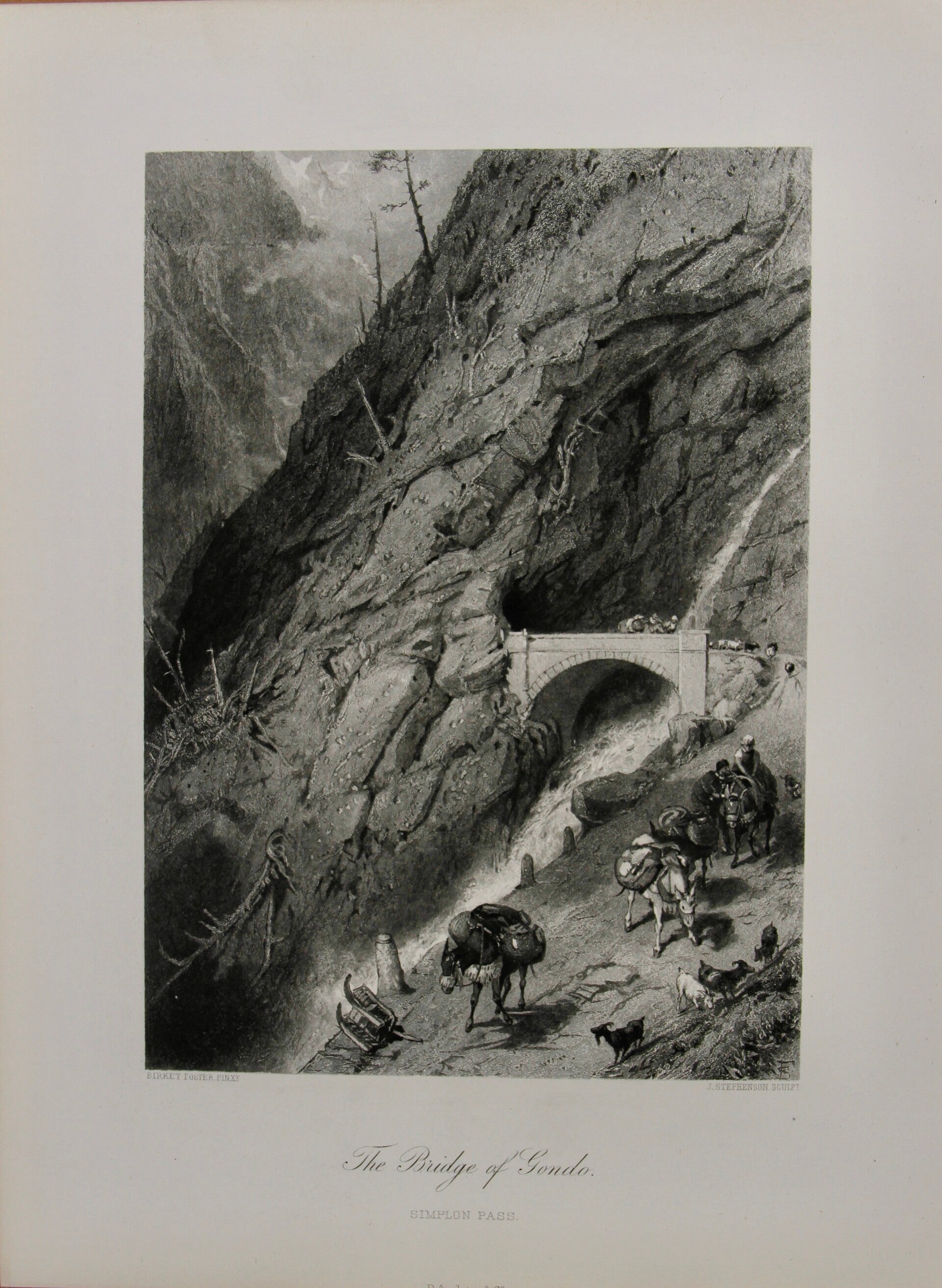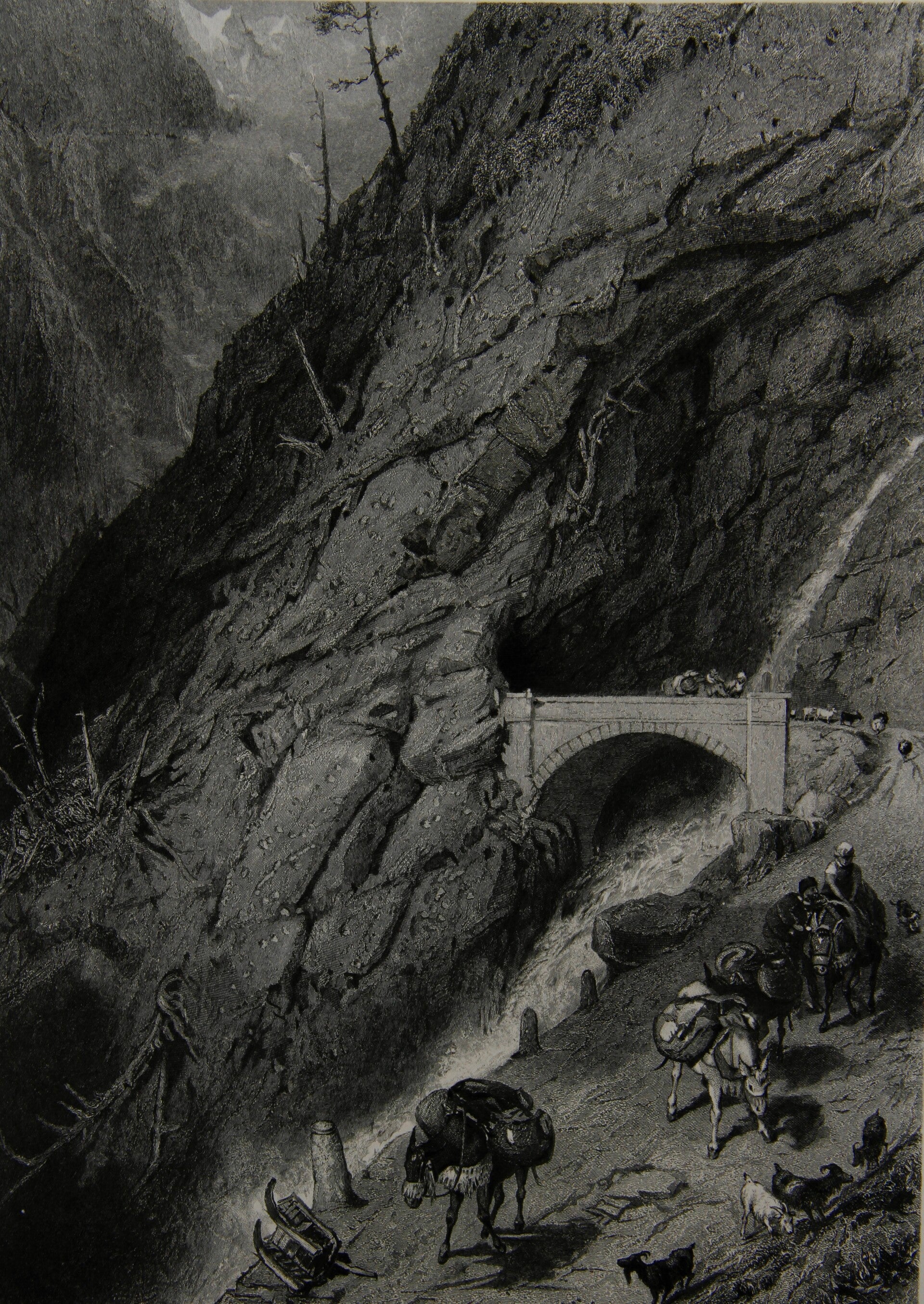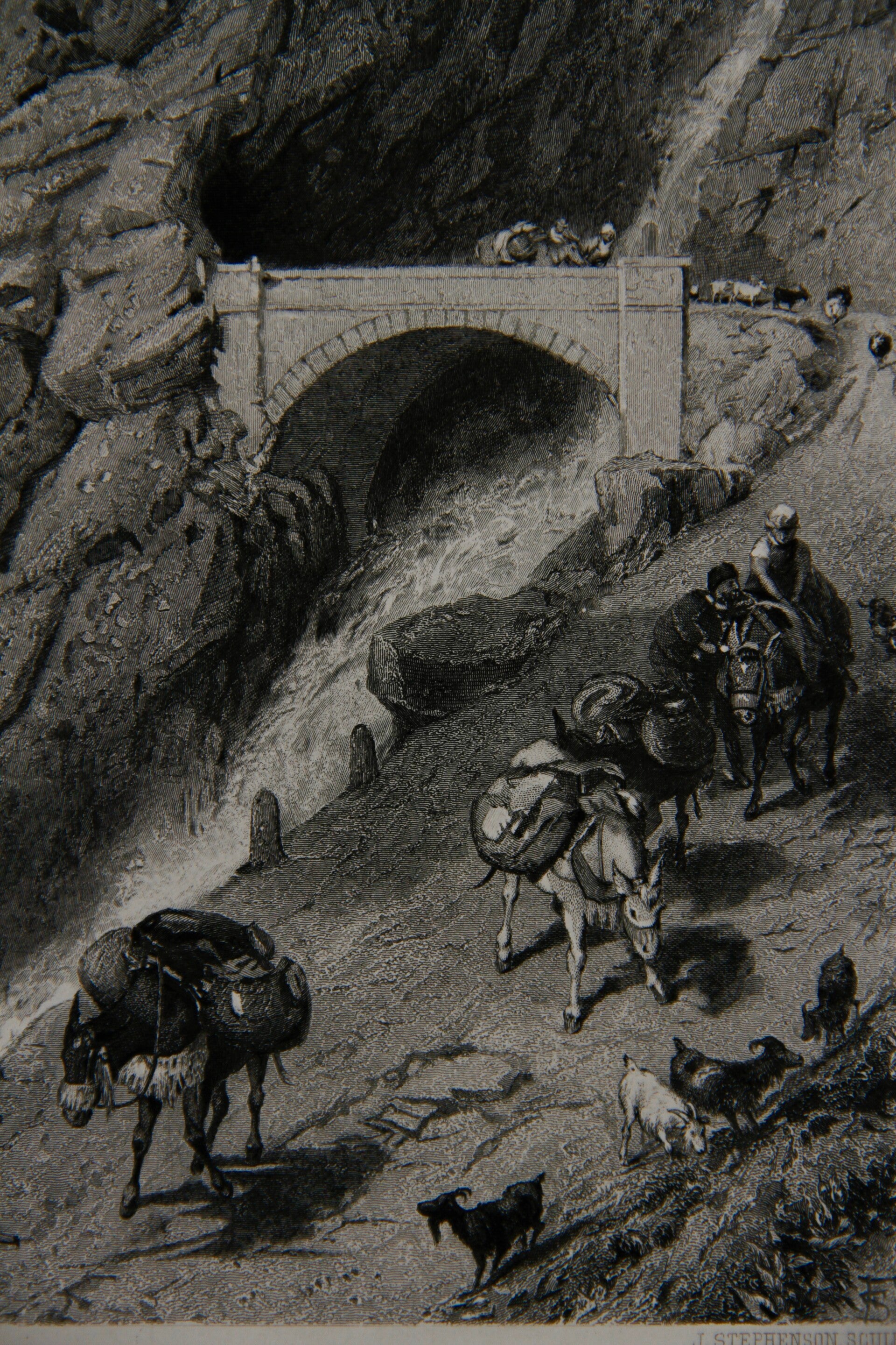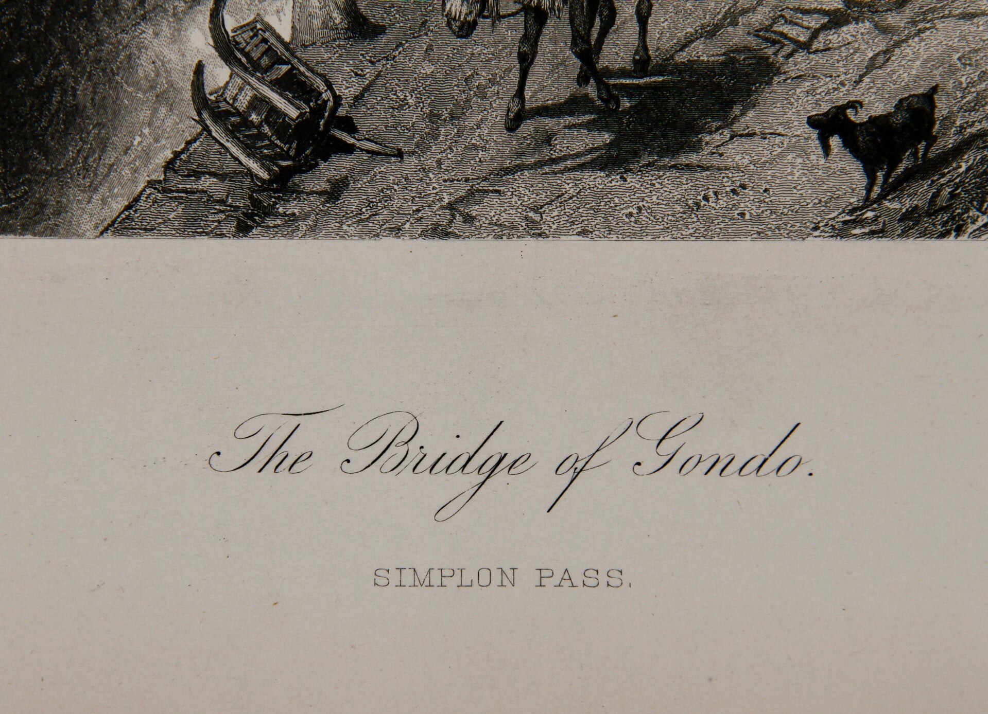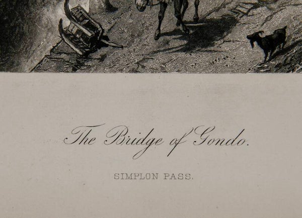 This 19th-century steel engraving "The Bridge of Gondo" after Birket Foster and engraved by J. Stephenson depicts a scenic view of the iconic bridge in Gondo, Switzerland. Viewers can see intricate details of the bridge's architecture, surrounded by the natural beauty of the Swiss landscape, featuring rugged mountains, a gushing waterfall and a mule caravan and livestock. Birket Foster's artistic style often emphasized detailed renderings of landscapes with a focus on capturing the atmosphere and mood of the scene. The engraving by J. Stephenson preserves the intricate lines and delicate shading of Foster's original artwork, conveying the serene beauty and timeless charm of the Bridge of Gondo as envisioned by the artist.