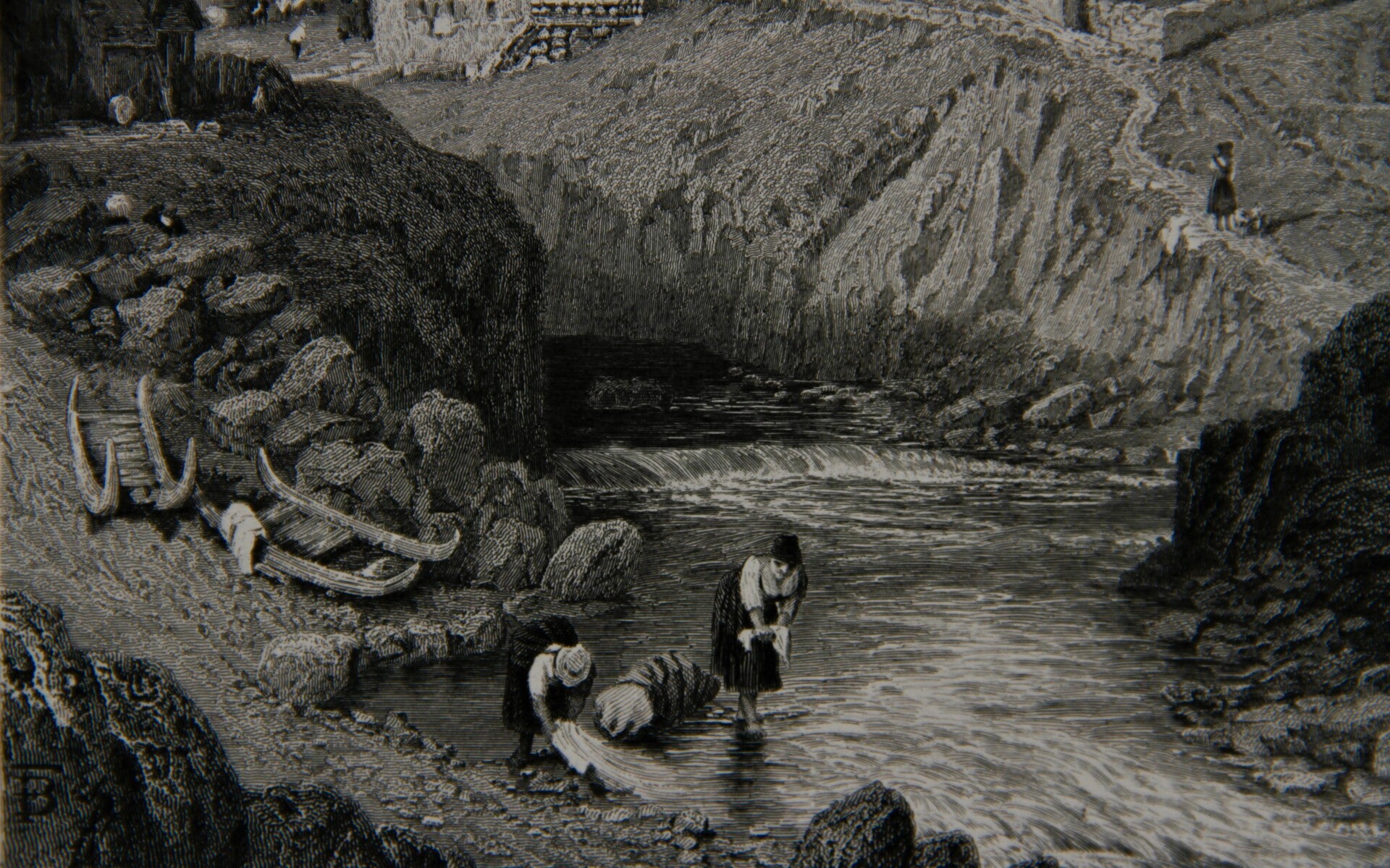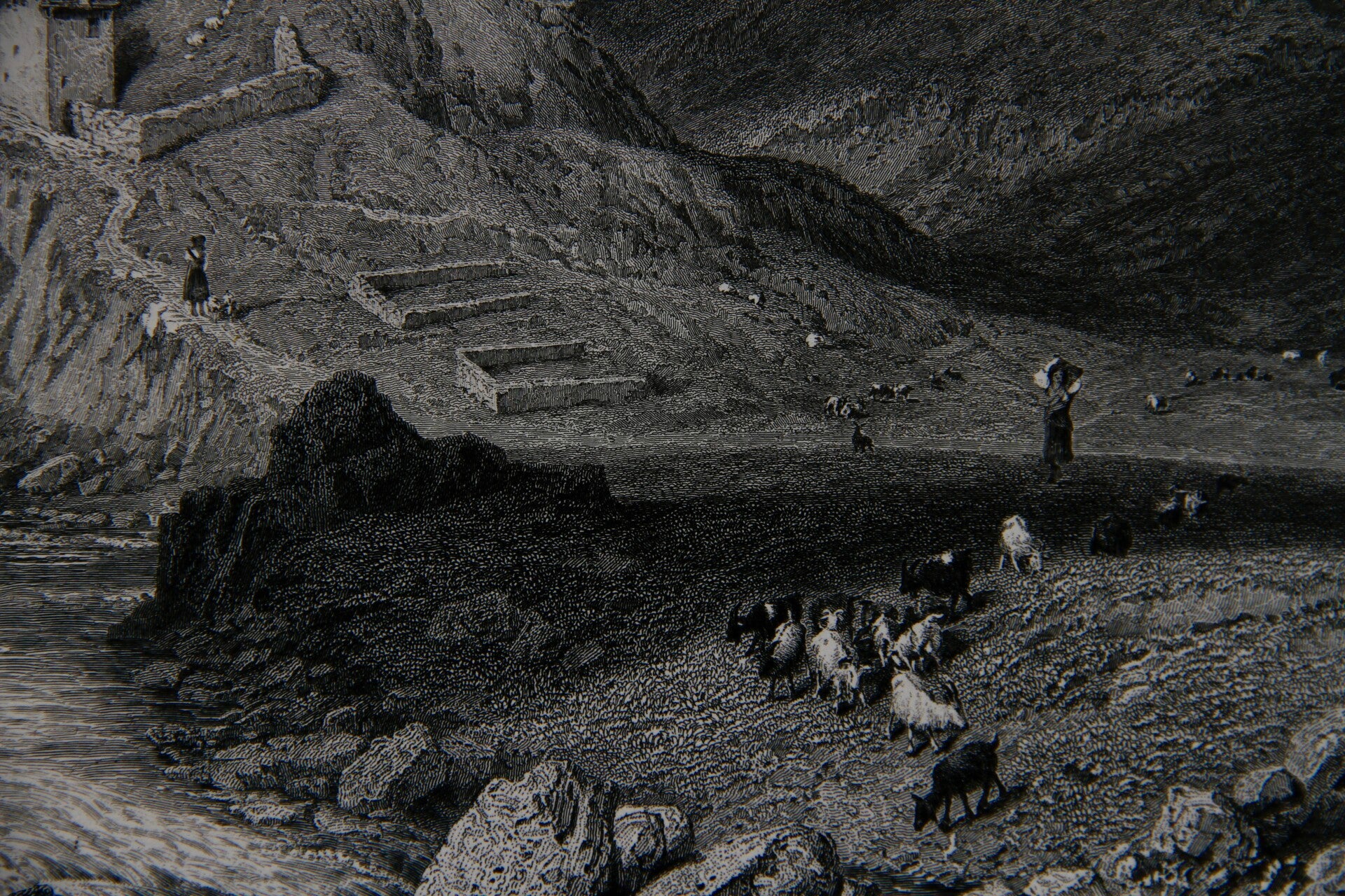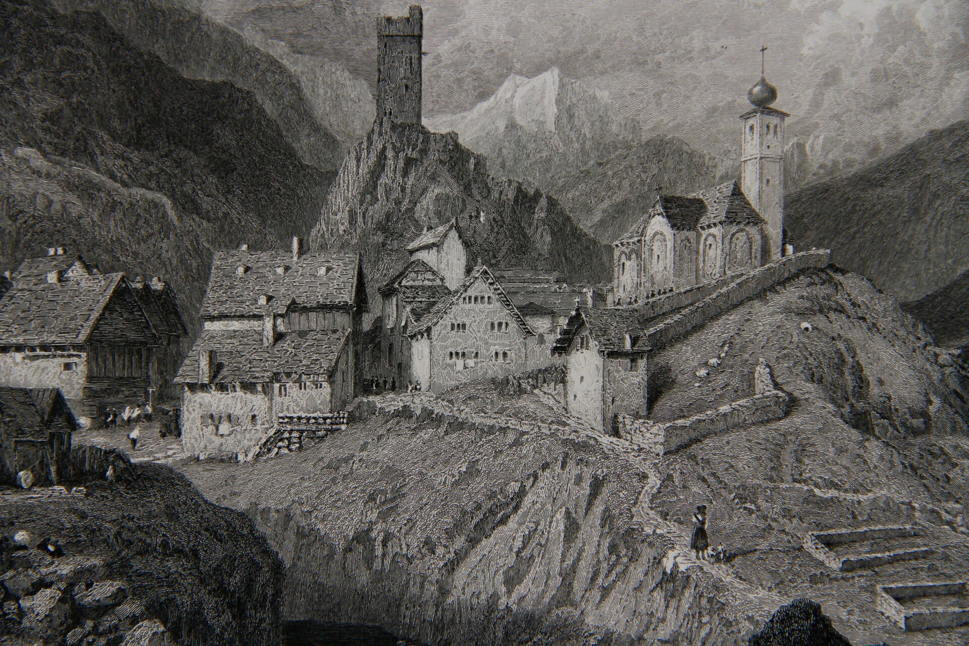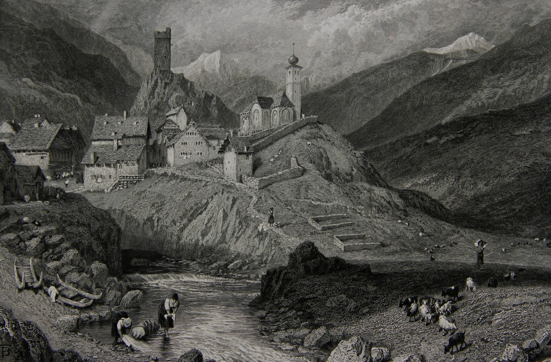 "Hospenthal, St. Gotthard Pass, Switzerland" is a 19th-century steel engraving created by Birket Foster and engraved by Saddler. This particular engraving showcases the picturesque setting of Hospenthal, a village located along the historic St. Gotthard Pass in Switzerland. Birket Foster's artistic style is known for its attention to detail and capturing the natural beauty of landscapes and the daily lifestyle of its inhabitants. Saddler's engraving skills translates Foster's work onto steel plates with precision and finesse. The engraving depicts the charming village nestled amidst the Swiss Alps, surrounded by rugged mountains and showcasing local architecture and scenes of daily life. This collaboration has resulted in a visually stunning and historically significant representation of a 19th-century Swiss landscape.
