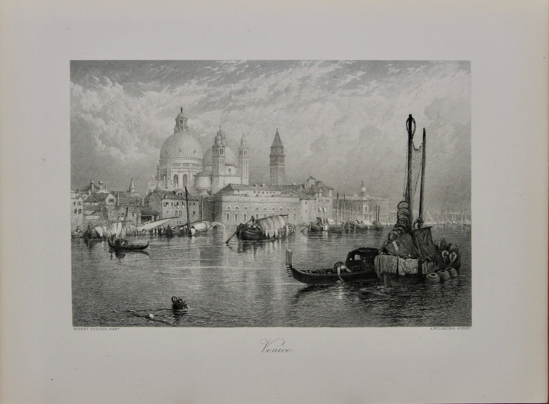 This 19th-century steel engraving titled "Venice" after Birket Foster and engraved by A. Willmore portrays the iconic cityscape of Venice, Italy. Birket Foster's artistic style often emphasized intricate details and romanticized views of landscapes, which is evident in this engraving. This depiction of Venice includes its elegant architecture, and bustling maritime activity. A. Willmore's engraving skillfully translates Foster's intricate artwork onto the steel plate, capturing the essence of Venice with precision and finesse. The result is a visually stunning representation of the enchanting city of Venice during the 19th century, offering viewers a glimpse into its timeless beauty and charm.