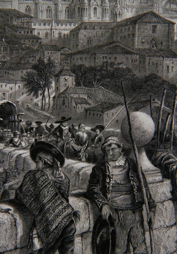 This 19th-century print titled "The Bridge of Salamanca" after Harry Fen and engraved by J. Godfrey depicts the iconic bridge in Salamanca, Spain. Harry Fen, known for his detailed and picturesque illustrations, captures the architectural beauty and historical significance of the bridge and illustrates it as an important passage for trade and commerce. The print showcases the graceful arches and intricate details of the bridge, with the surrounding architecture and the Tormes River flowing beneath and historic buildings lining its banks. J. Godfrey's engraving skills translate Fen's artwork onto the printing plate, bringing out the fine details and textures of the scene with expertise. This collaboration results in a captivating portrayal of the Bridge of Salamanca, offering viewers a glimpse into the rich cultural heritage of the city during the 19th century.