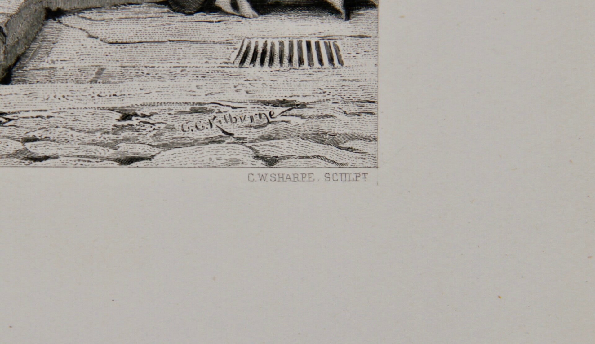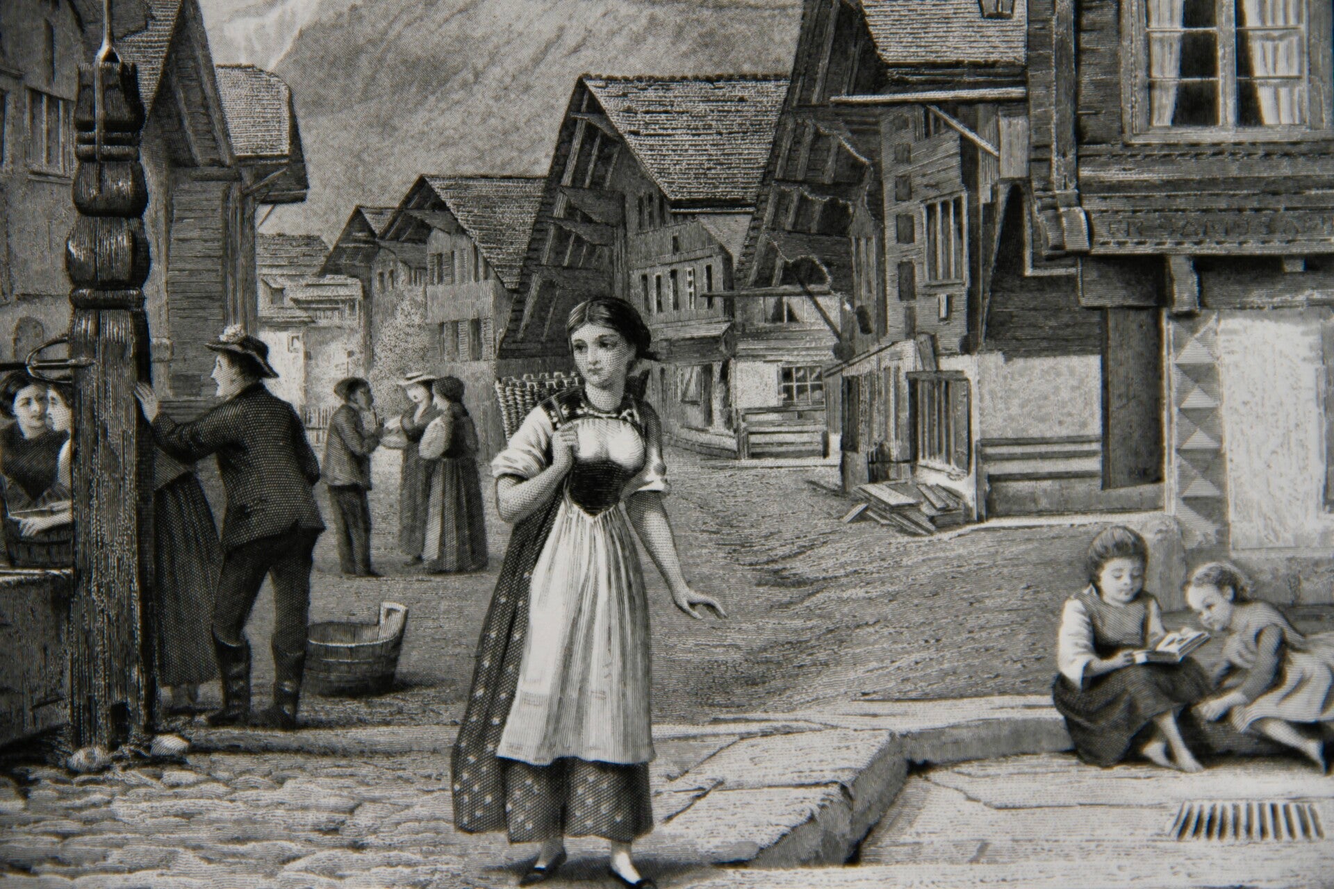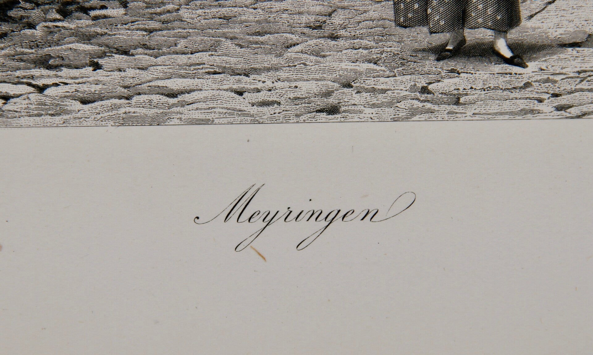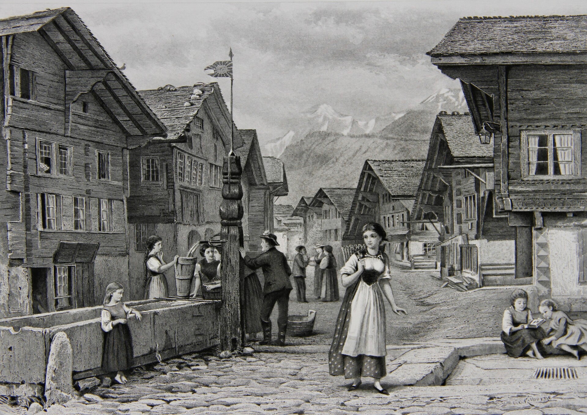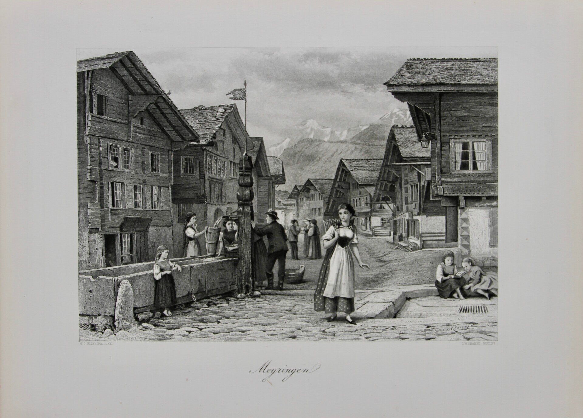 This 19th-century print titled "Meyringen" after G.G. Kilburne and engraved by C.W. Sharpe depicts the charming Swiss village of Meiringen. G.G. Kilburne, known for his skillful portrayal of landscapes and architecture, captures the quaint beauty of Meiringen with attention to detail and accuracy. The print showcases the village nestled amidst the majestic Swiss Alps, with traditional chalets, and village people fetching water and going about their daily life. C.W. Sharpe's engraving expertise translates Kilburne's artwork onto the printing plate, enhancing the texture and depth of the scene. This collaboration results in a visually striking representation of Meiringen, offering viewers a glimpse into the idyllic Swiss country life during the 19th century.