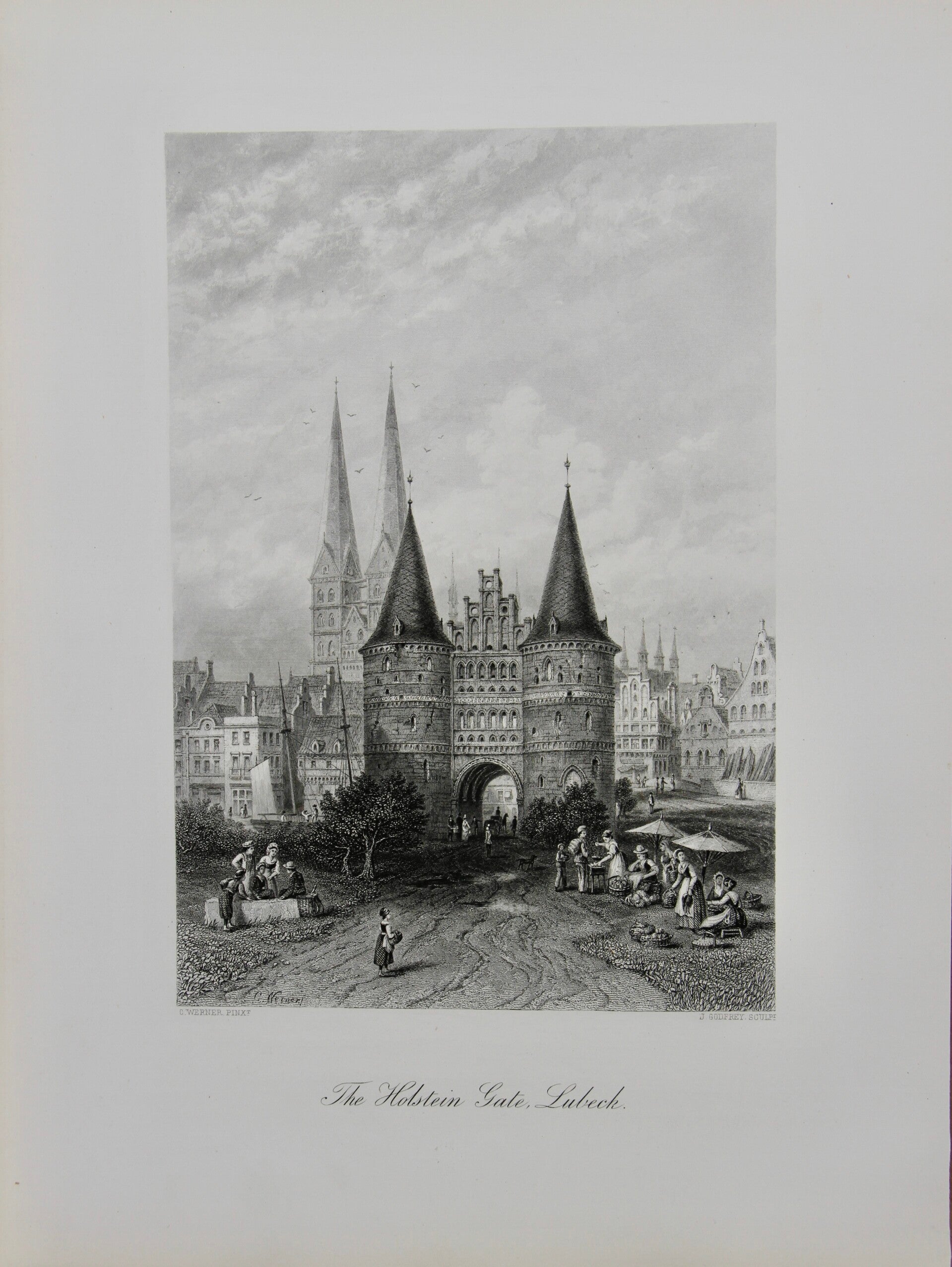 "The Holstein Gate, Lübeck" is a 19th-century print that portrays the Holstein Gate, a significant landmark in the city of Lübeck, Germany. Created after C. Werner and engraved by J. Godfrey, the print captures the majestic architecture of the gate, showcasing its towering presence and intricate design details. As a prominent symbol of Lübeck's rich history and cultural heritage, the Holstein Gate has been a popular subject for artists during the 19th century. The print conveys the gate's imposing structure, with its twin towers, arched passageway, and decorative elements, offering viewers a glimpse into the grandeur of Lübeck's architectural landscape during that time period.