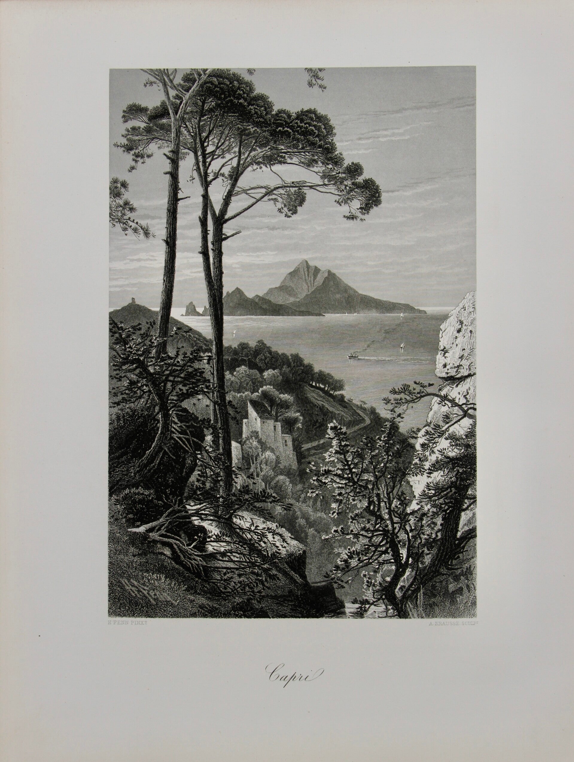 "Capri" is a 19th-century print depicting the picturesque island of Capri, located in the Tyrrhenian Sea off the Sorrentine Peninsula, Italy. Created after Harry Fenn and engraved by A. Krausse, the print captures the island's stunning natural beauty and scenic landscapes. It features panoramic views of Capri's rugged coastline, dramatic cliffs, and azure waters, as well as iconic landmarks such as the Faraglioni rock formations or the Blue Grotto. Fenn's artistic style and attention to detail, along with Krausse's engraving expertise, brings to life the enchanting charm of Capri, offering viewers a romanticized portrayal of this idyllic Mediterranean destination.