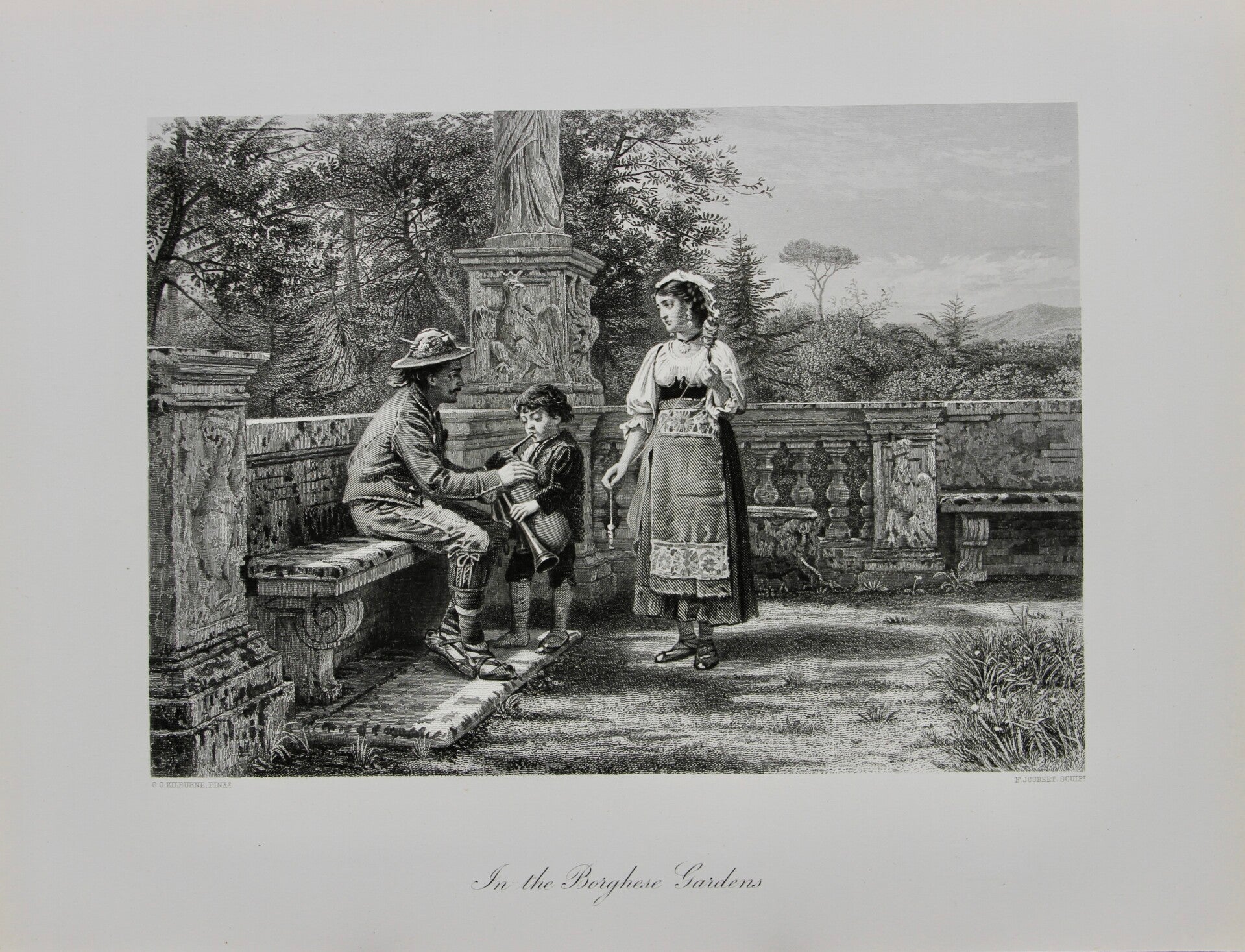 This 19th-century print "In the Borghese Gardens," after G.G. Kilburne and engraved by F. Joubert, depicts a tranquil scene of a family enjoying the day within the Borghese Gardens in Rome, Italy. Kilburne's artistic talent captures the serene atmosphere of the gardens, featuring lush greenery, stunning garden architecture , and a family enjoying and relaxing. Joubert's engraving skills adds depth and detail to Kilburne's composition, bringing to life the beauty and charm of one of Rome's most beloved green spaces. This print offers viewers a nostalgic glimpse into the idyllic ambiance of the Borghese Gardens during the 19th century.