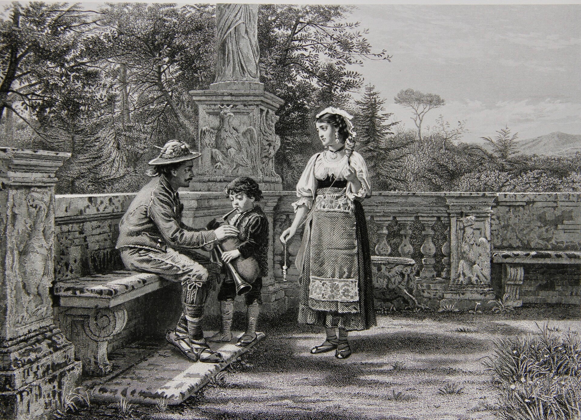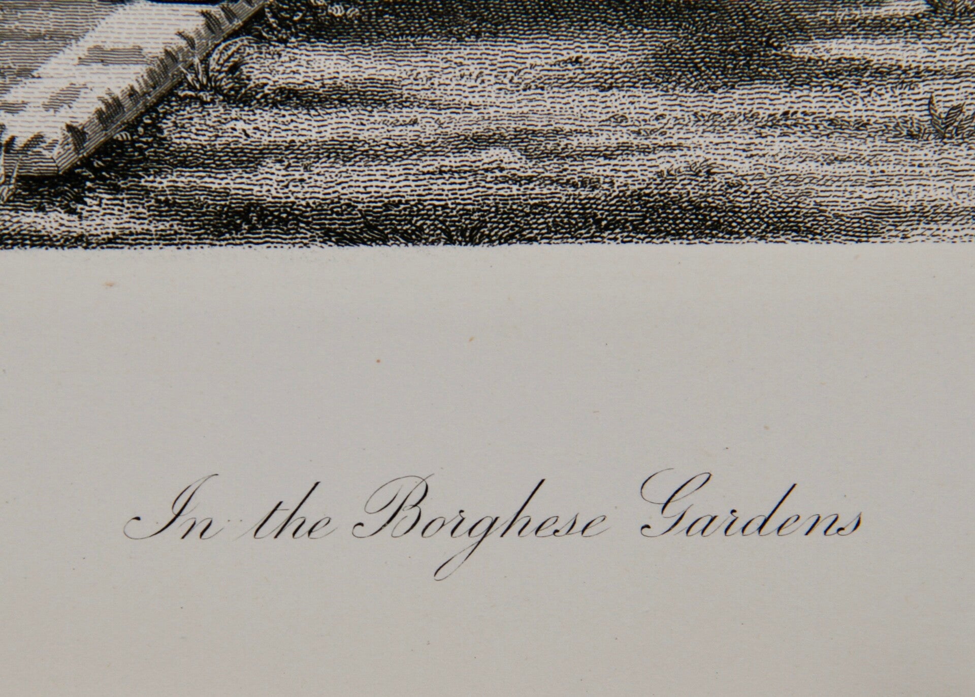19th century steel engraving print “In the Borghese Gardens”