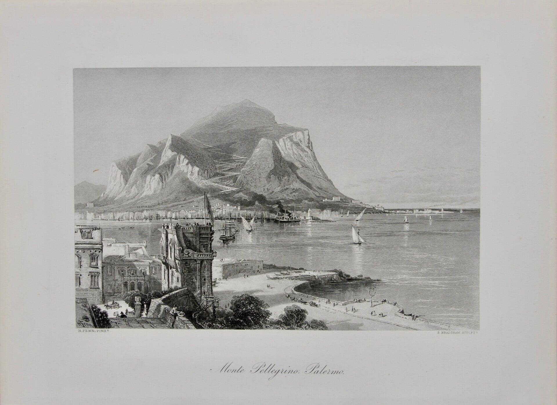 This 19th-century print "Monte Pellegrino, Palermo" after Harry Fenn and engraved by S. Bradshaw portrays the picturesque landscape of Monte Pellegrino overlooking the city of Palermo in Sicily, Italy. Fenn's artistic style captures the natural beauty of the rugged mountain, surrounded by a glimpse of the cityscape and shoreline below. Bradshaw's engraving adds intricate detail and texture to bring Fenn's vision to life on paper, offering viewers a romanticized view of this iconic Sicilian landmark.