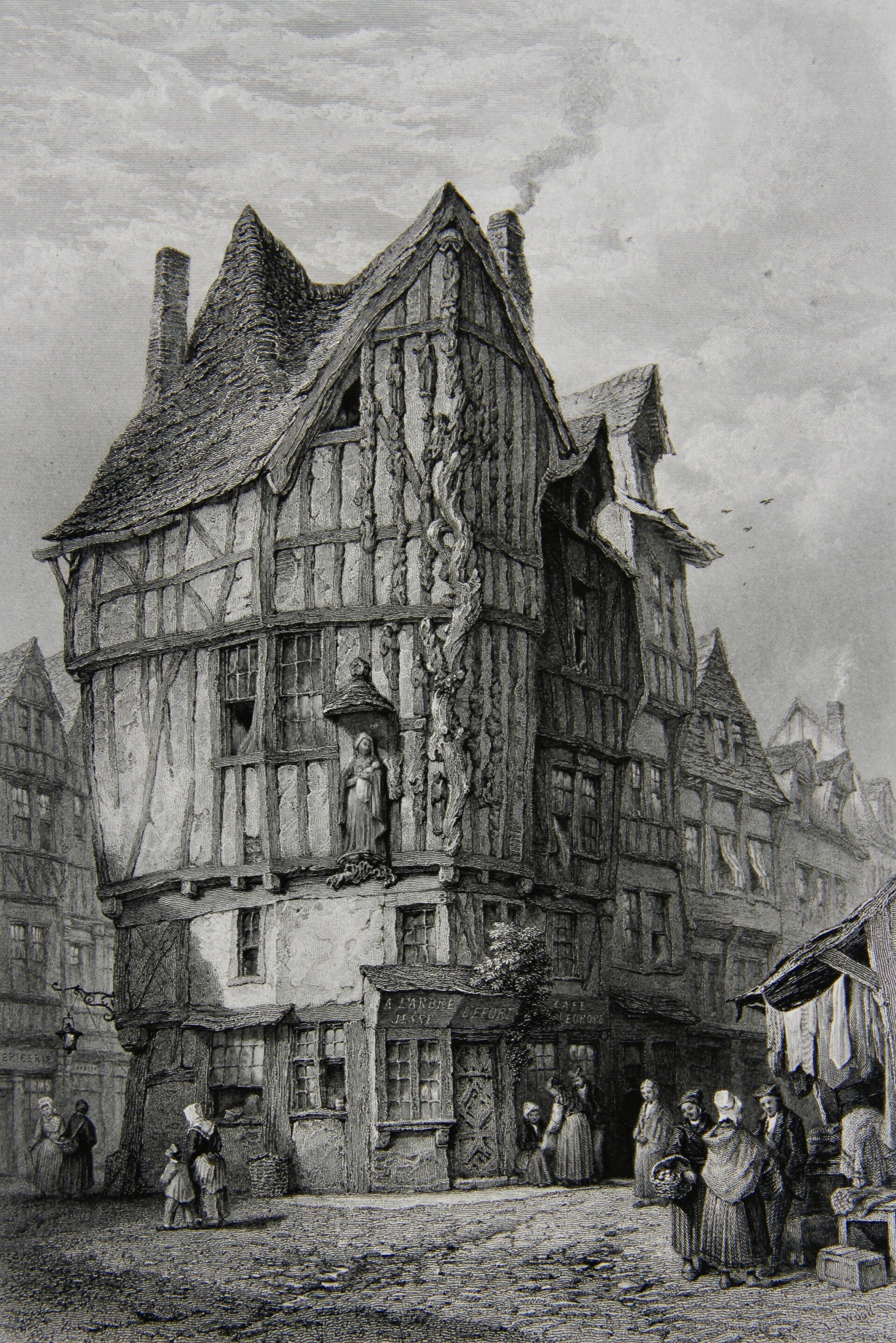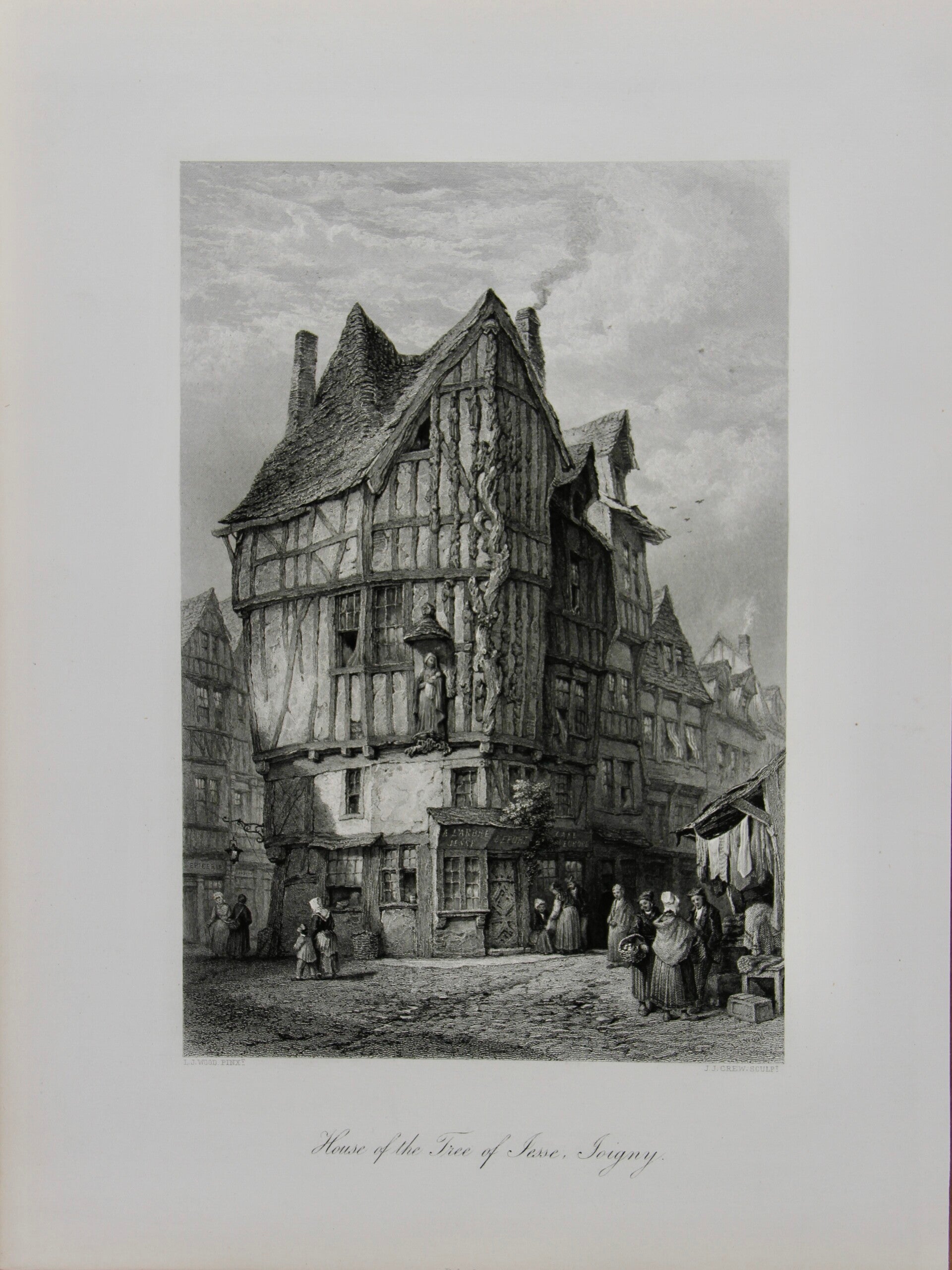 This 19th-century print "House of the Tree of Jesse, Joigny" is a depiction of the historical House of the Tree of Jesse in Joigny, France. Created by artist L.G. Wood and engraved by J.J. Crew, the print captures the charm and character of this architectural landmark. With Wood's artistic vision and Crew's engraving skill, the print showcases the intricate details of the house and its surroundings, inviting viewers to appreciate the beauty of this historical site.