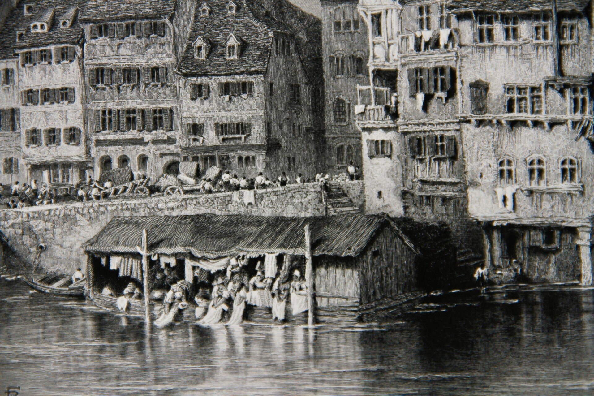 "Old Houses, Strasburgh” is a 19th-century print after Birket Foster, engraved by J. Saddler. It depicts quaint, centuries-old houses in the charming city of Strasbourg, capturing the architectural elegance and historical ambiance of the region. The print showcases intricately designed timber-framed buildings adorned with decorative elements, reflecting the unique character of Strasbourg's old town. With Foster's artistic vision and Saddler's engraving skill, the print presents a picturesque scene of its residents going about their daily lives evoking nostalgia for bygone eras and showcasing the enduring charm of Strasbourg's architecture and its inhabitants in the 19th century.