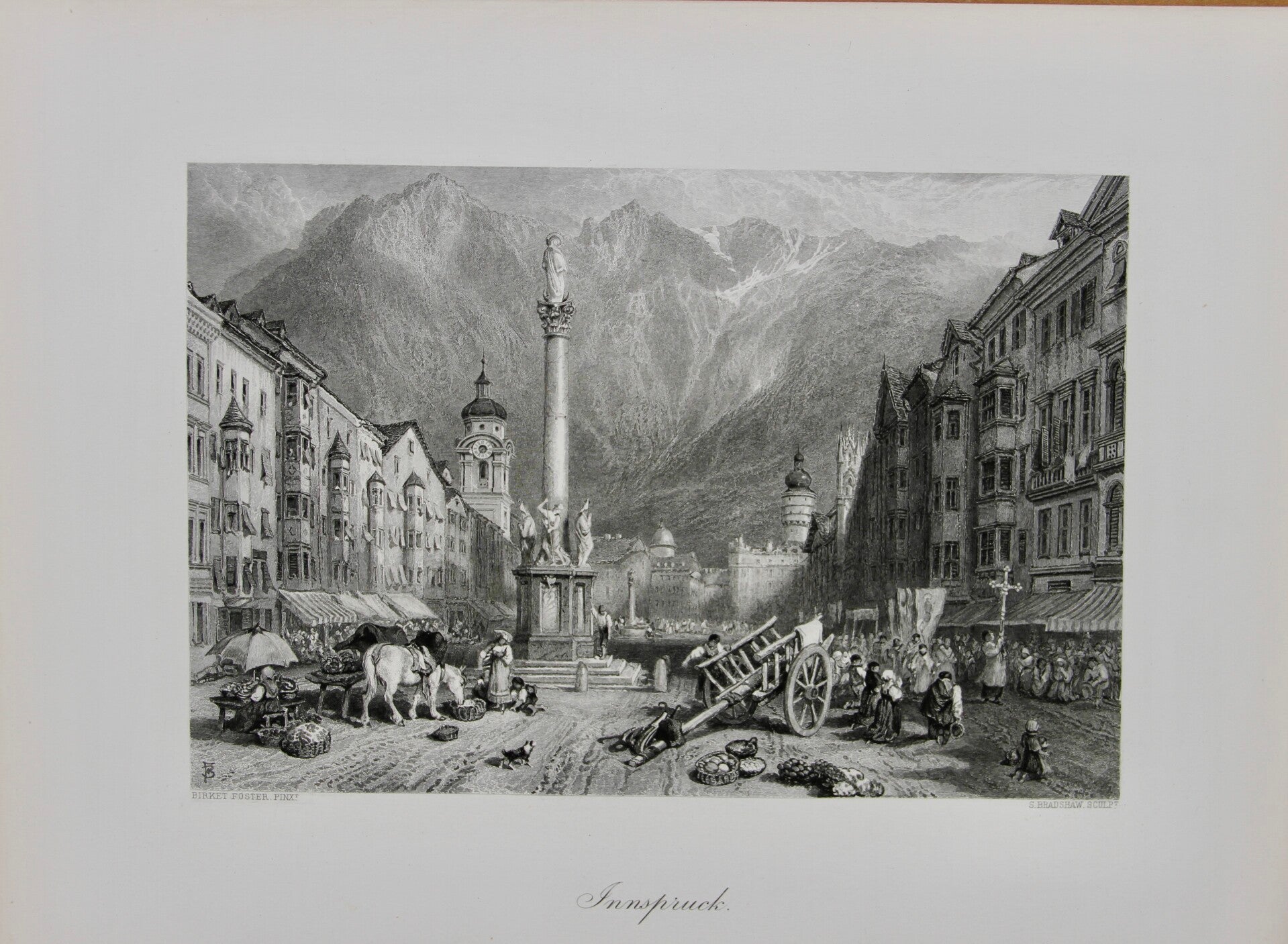 "Innsbruck" is a 19th-century print after Birket Foster, engraved by A. Bradshaw. This print depicts the picturesque city of Innsbruck, Austria, nestled amidst the stunning Alpine landscape. Foster's artistic prowess captures the charm of Innsbruck's historic architecture, with its colorful buildings, the bustling city square, and iconic landmarks such as the Golden Roof. Bradshaw's engraving expertise enhances the intricate details of the print, showcasing the beauty and grandeur of Innsbruck against the backdrop of majestic mountains. Overall, the print offers viewers a captivating glimpse into the romantic allure of daily life in this Austrian city during the 19th century.