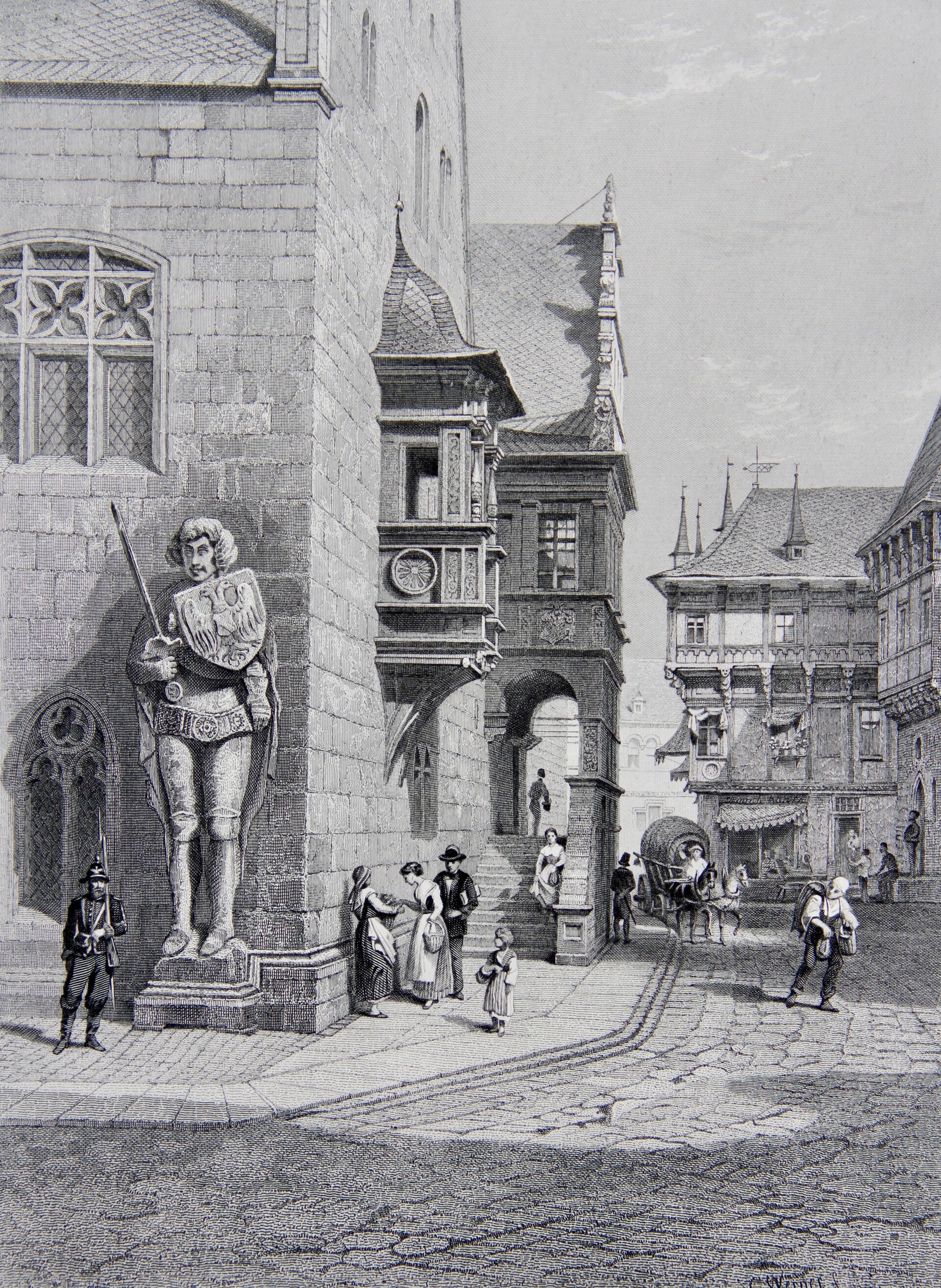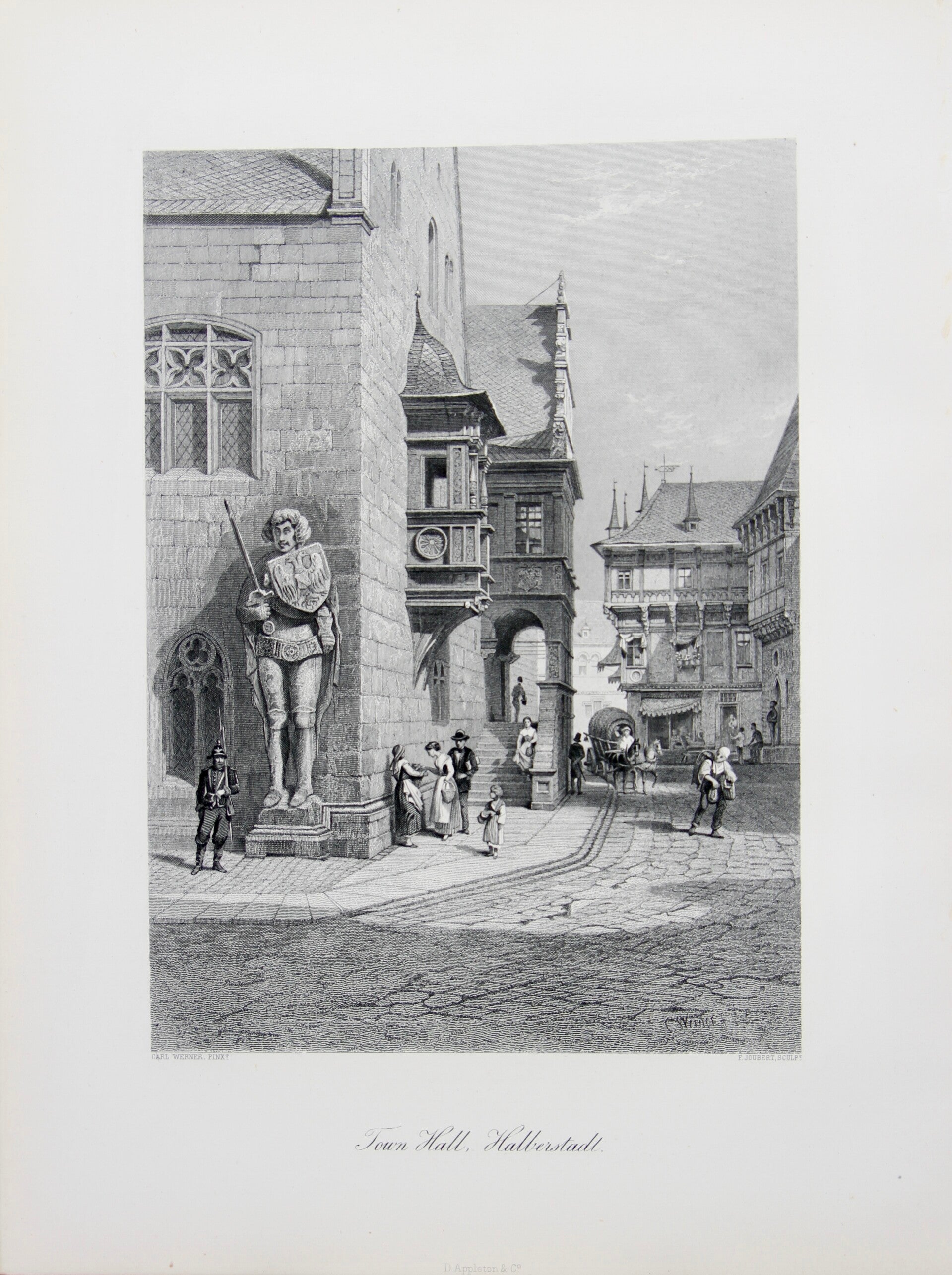 In this 19th-century print titled "Town Hall, Halberstadt," Carl Werner's depiction, enhanced by E. Joubert's engraving, vividly captures the architectural splendor and historical importance of Halberstadt's town hall. Known for his meticulous architectural illustrations, Werner's work highlights the ornate facade and unique features of the building. Through Joubert's skilled engraving, the print offers intricate details, providing viewers with a glimpse of daily life in the town and a journey into the past.