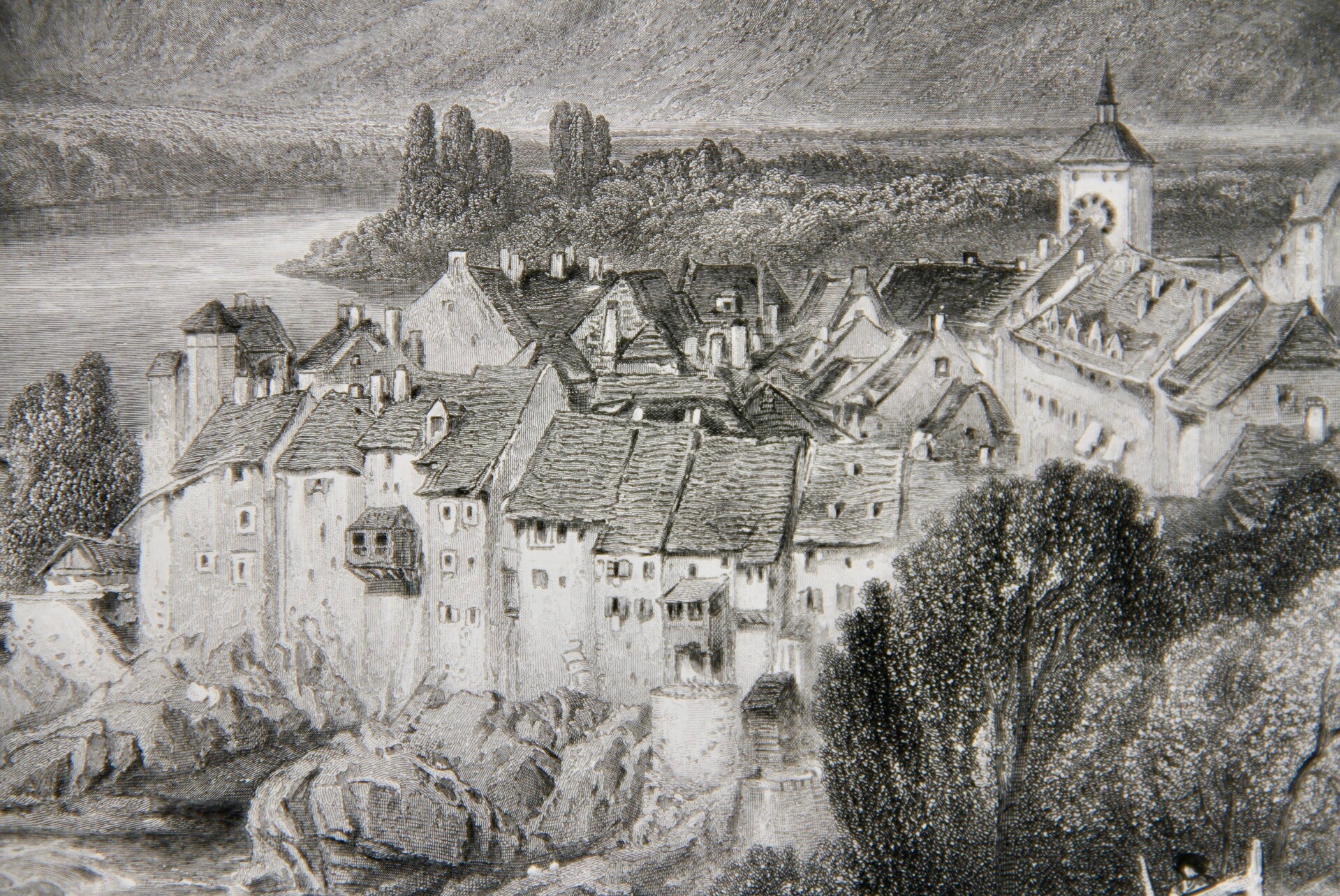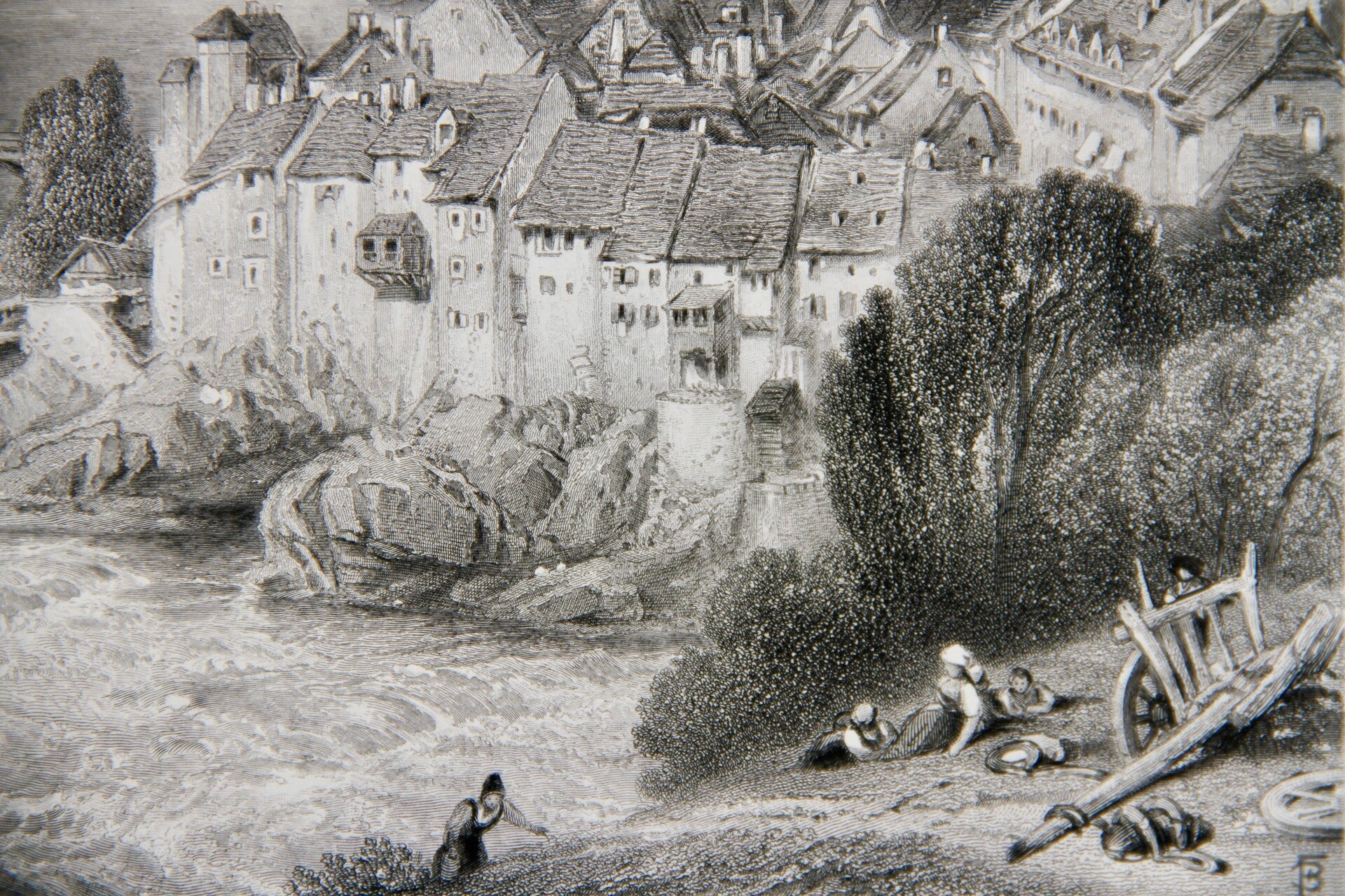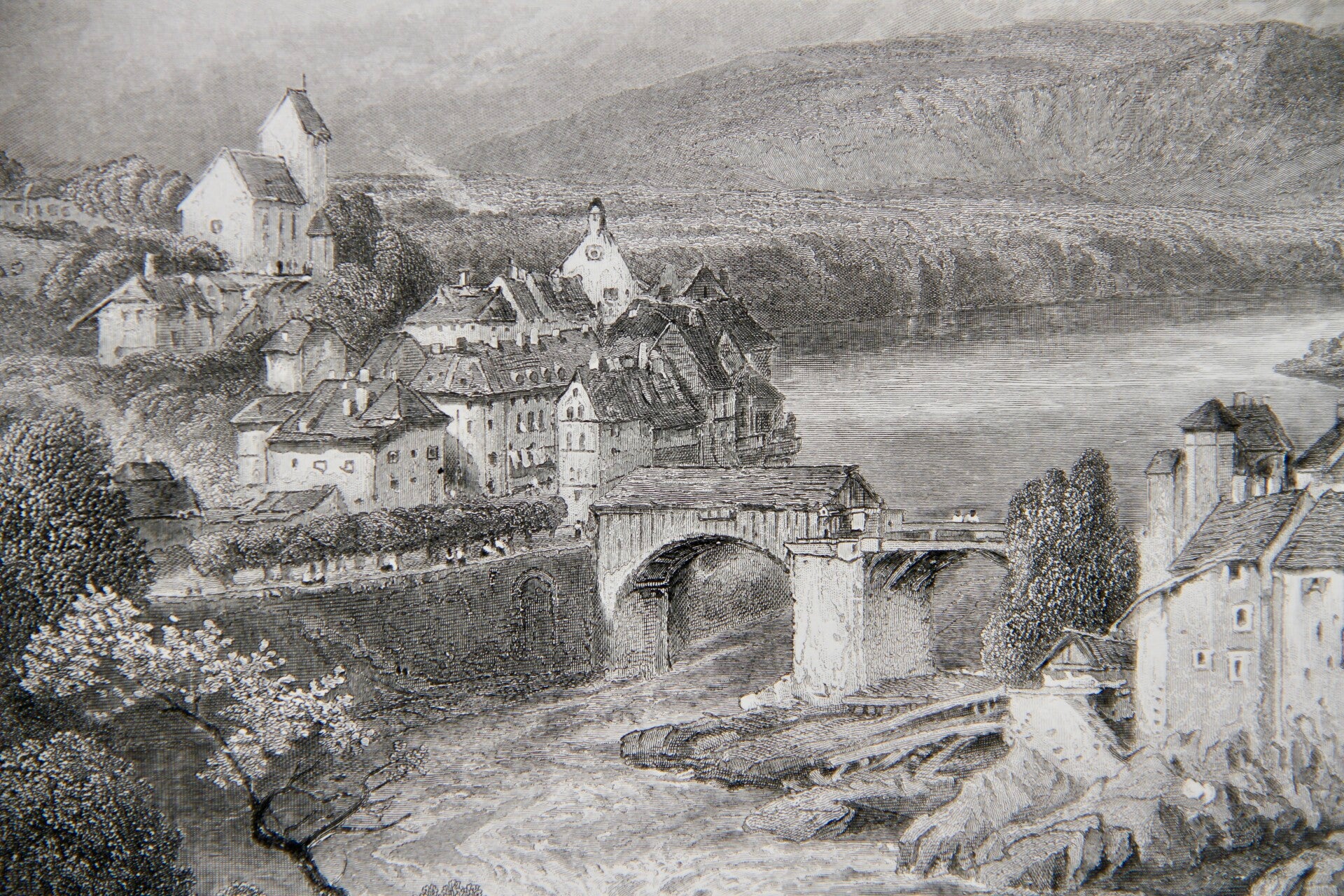 19th century steel engraved print “The Rhine at Lauffenberg”