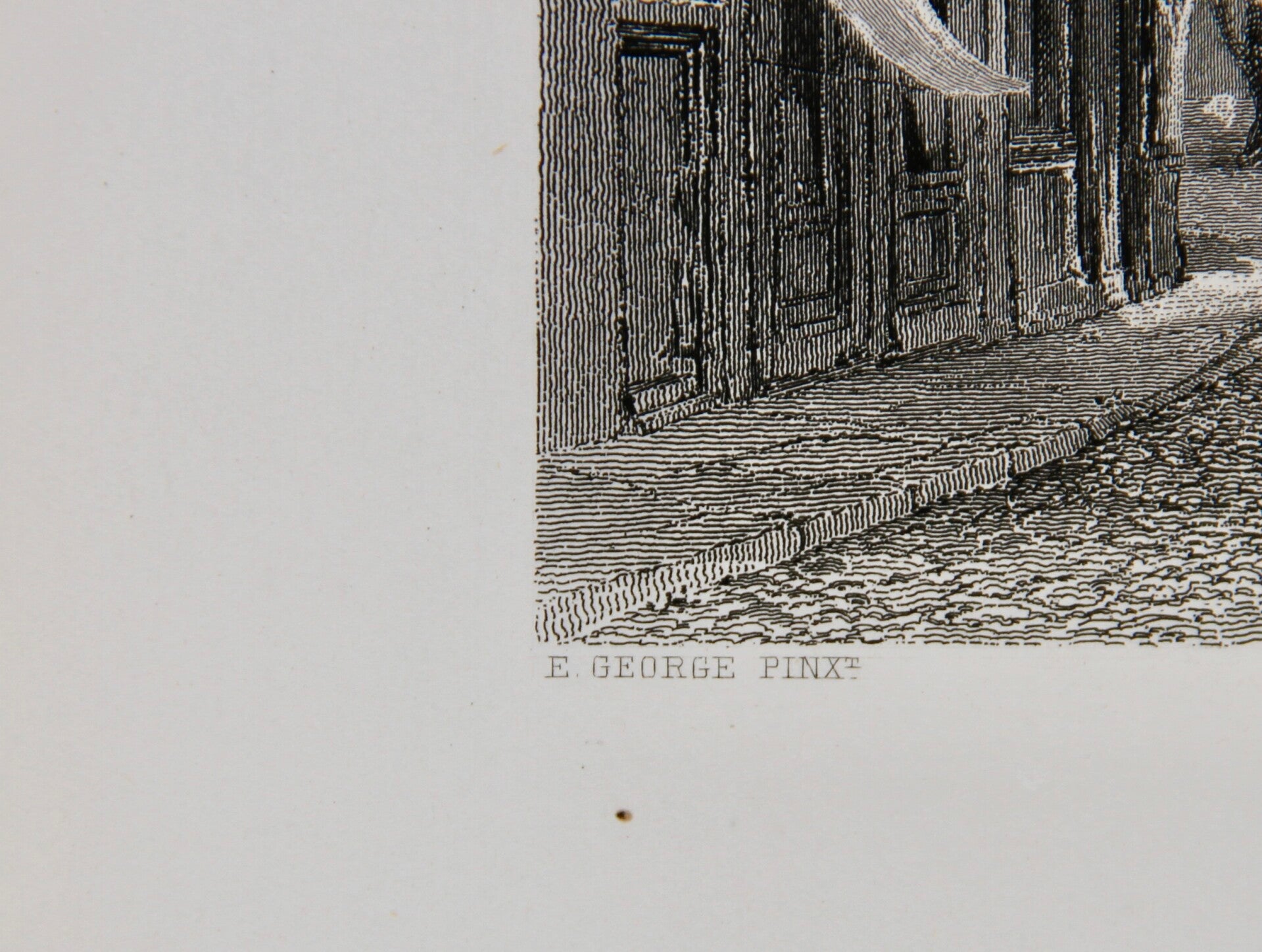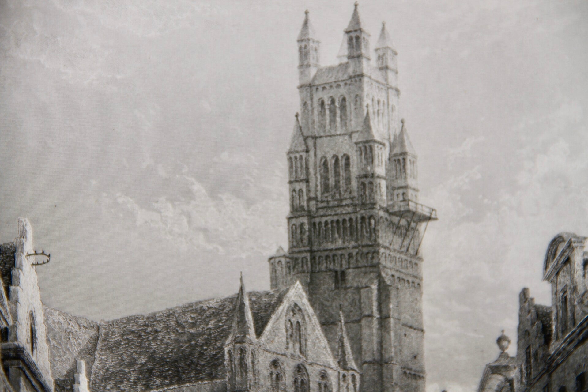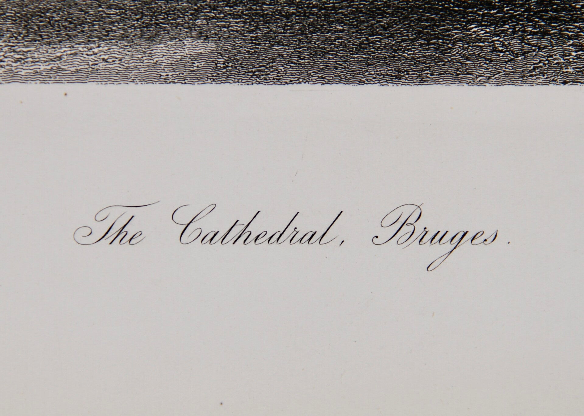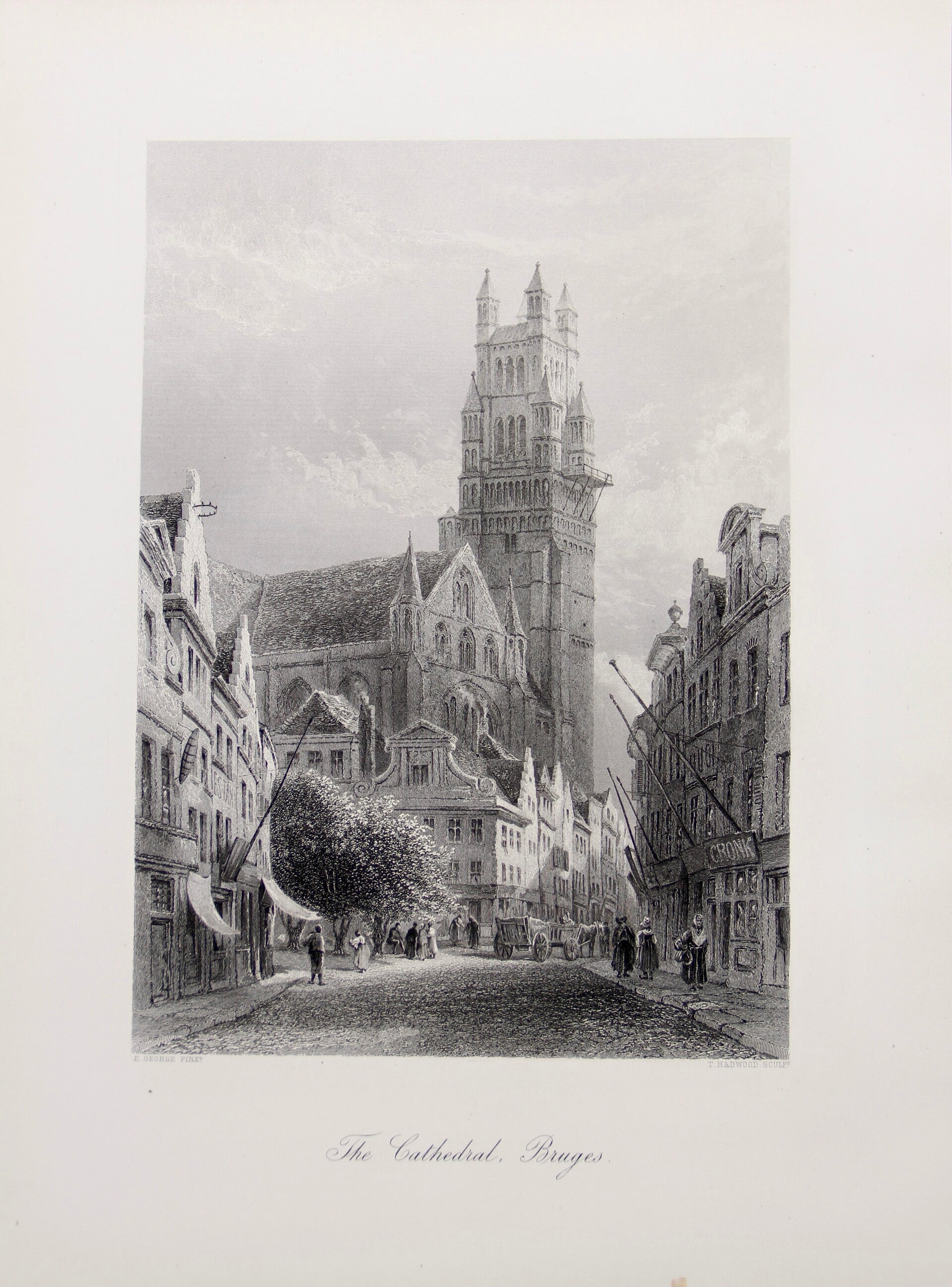 "The Cathedral, Bruges" is a 19th-century print depicting the grandeur of the medieval cathedral in Bruges, Belgium. The print, created after E. George and engraved by Hadwood, captures the intricate architectural details and imposing presence of the cathedral. The artist's attention to detail brings to life the Gothic spires, elaborate facades, and towering columns of the cathedral, while the engraver's skill enhances the fine lines and textures, adding depth and realism to the scene. The print showcases the cathedral as a symbol of religious and architectural significance during the 19th century, inviting viewers to admire its beauty and historical importance.