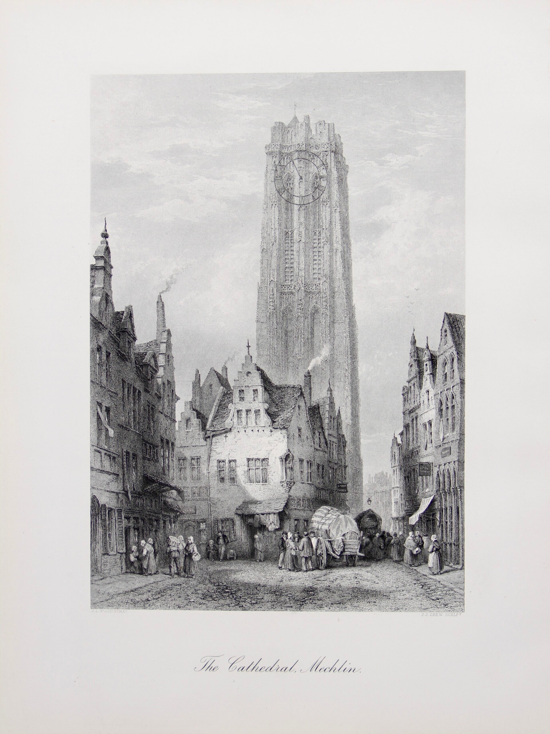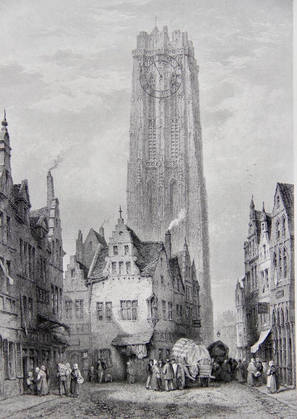 "The Cathedral, Mechlin" is a 19th-century print that portrays the majestic Cathedral of St. Rumbold in Mechelen (also known as Mechlin), Belgium. Created after L.J. Wood and engraved by J.J. Crew, the print captures the architectural splendor and grandeur of the cathedral. With meticulous detail, the artist depicts the intricate Gothic architecture, including the soaring spires, ornate façade, and intricate carvings adorning the cathedral's exterior. The engraver's skill further enhances the print, adding depth and texture to the fine lines and intricate details. This print serves as a testament to the significance of the Cathedral of St. Rumbold as a cultural and religious landmark during the 19th century, inviting viewers to marvel at its beauty and historical importance.