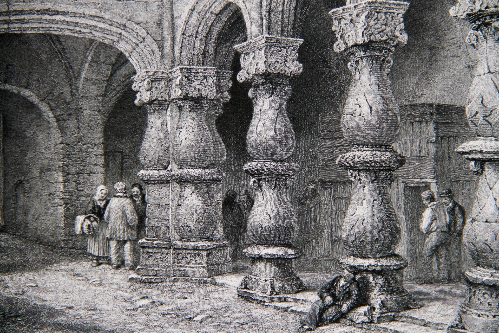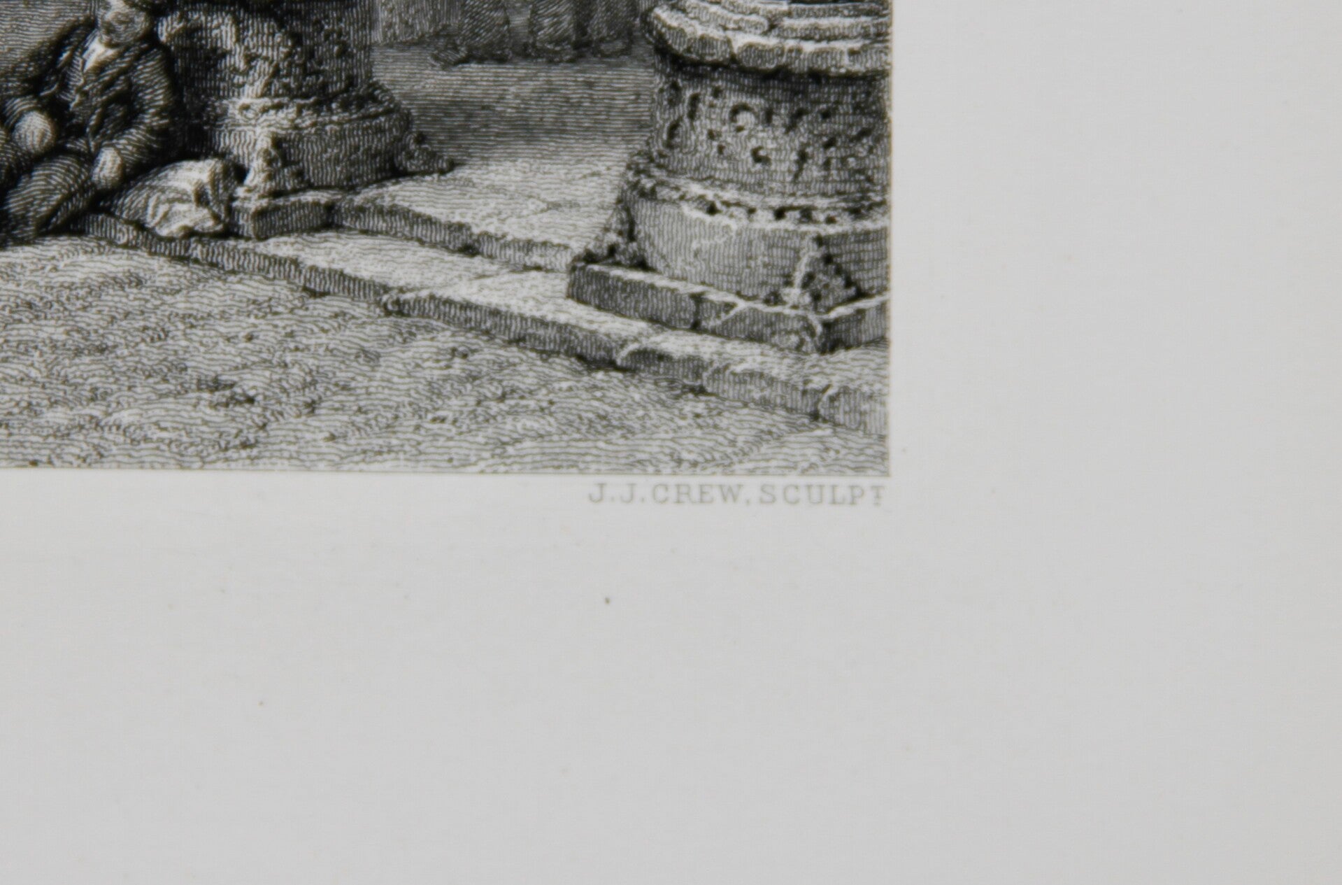 This 19th-century print titled "Courtyard of the Archbishop's Palace, Liege," created after L.J. Wood and engraved by J.J. Crew, offers a captivating glimpse into the serene ambiance of the Archbishop's Palace in Liege, Belgium. With meticulous attention to detail, the artist captures the architectural elegance of the courtyard, adorned with ornate arches, intricate stonework, and impressive columns. The engraver's skill brings depth and texture to the scene, enhancing the fine lines and subtle nuances of light and shadow. This print serves as a tribute to the historical and cultural significance of the Archbishop's Palace, inviting viewers to appreciate its beauty and tranquil atmosphere.