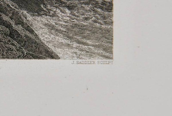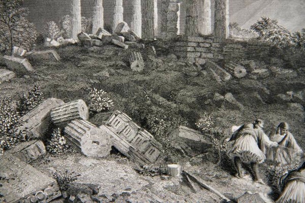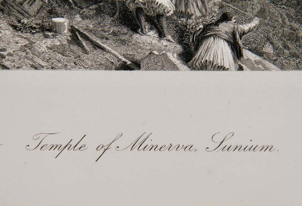 This 19th-century print titled "Temple of Minerva, Sunium," created after W. Simpson and engraved by J. Saddler, offers a captivating portrayal of the ancient Temple of Minerva at Cape Sounion, Greece. With meticulous detail, the artist captures the majestic ruins of the temple, set against the backdrop of the Aegean Sea and the rugged coastline. The engraver's skill enhances the intricate lines and textures, bringing to life the weathered columns, delicate carvings, and timeless beauty of the ancient structure. This print serves as a homage to the classical heritage and architectural mastery of ancient Greece, inviting viewers to marvel at the enduring splendor of the Temple of Minerva.