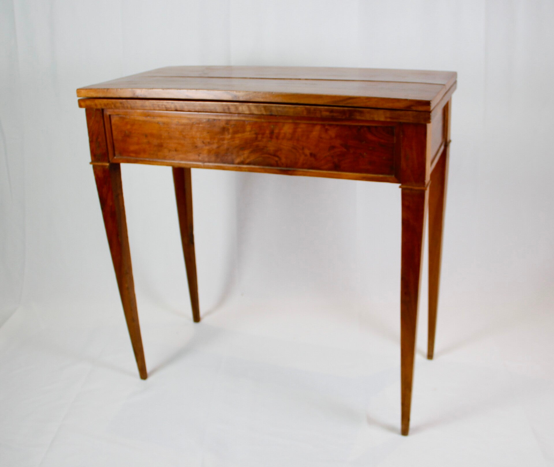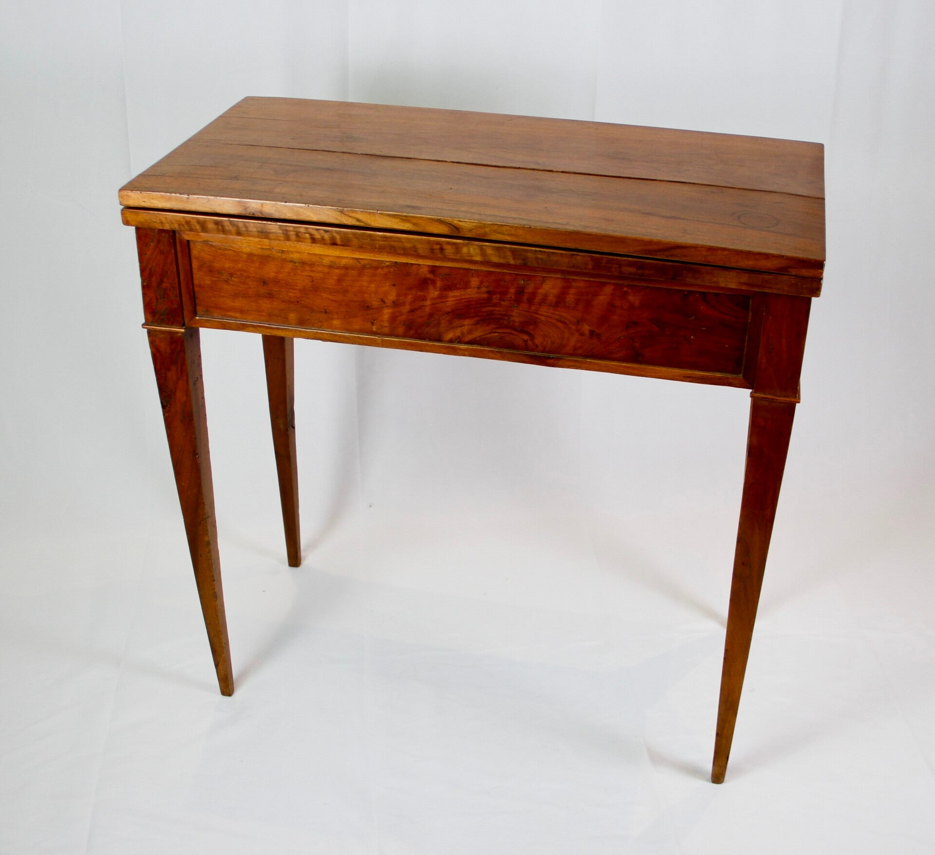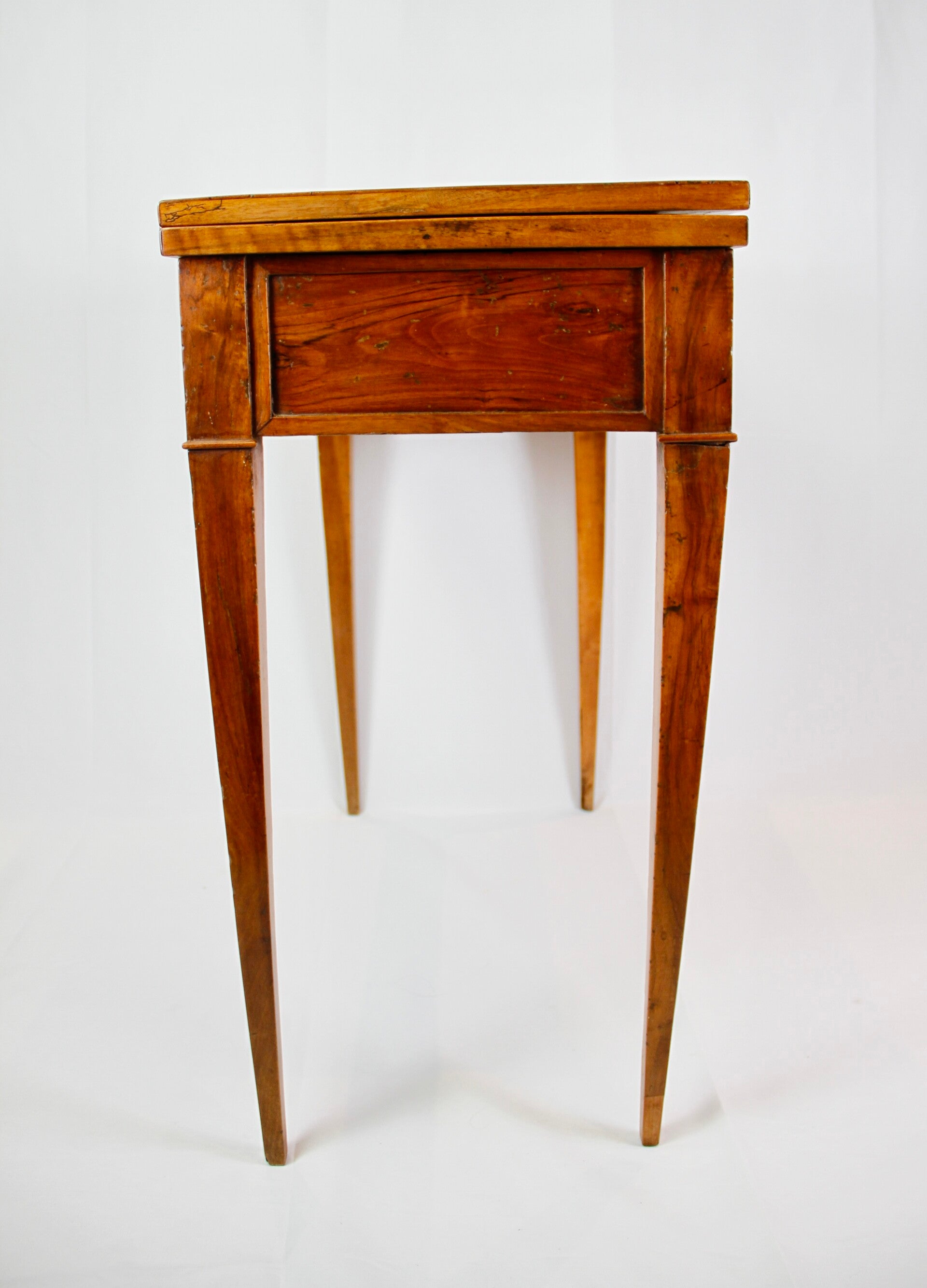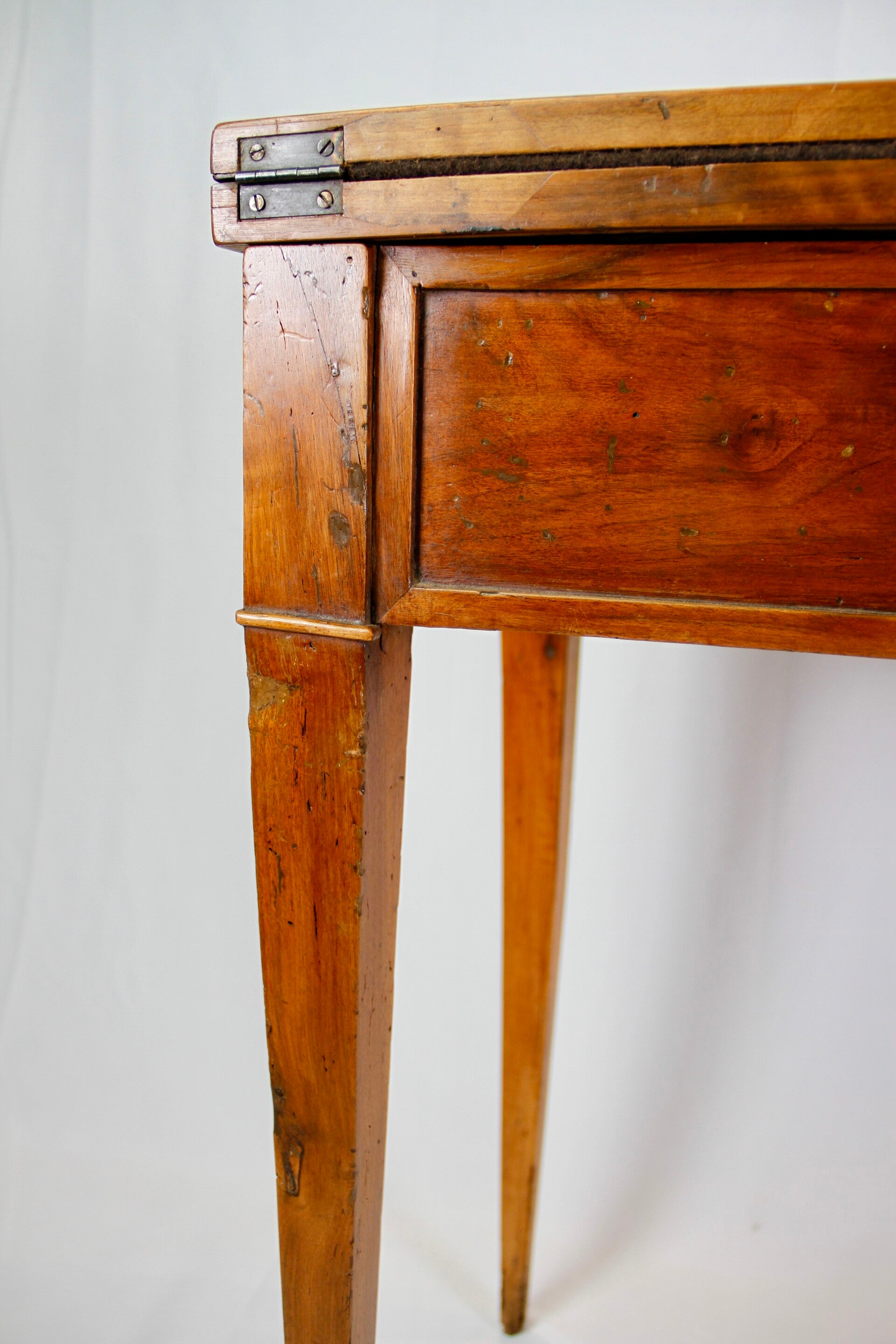 This 19th century French Provincial Directoire style walnut folding game table features a swivel double top, allowing for versatile gaming options. Its ingenious wooden spring locking system ensures stability during play. The felt-lined surface provides a comfortable feel for card games, while tapered legs offer elegance and support. Additionally, its interior storage space adds practicality, keeping gaming accessories neatly organized.