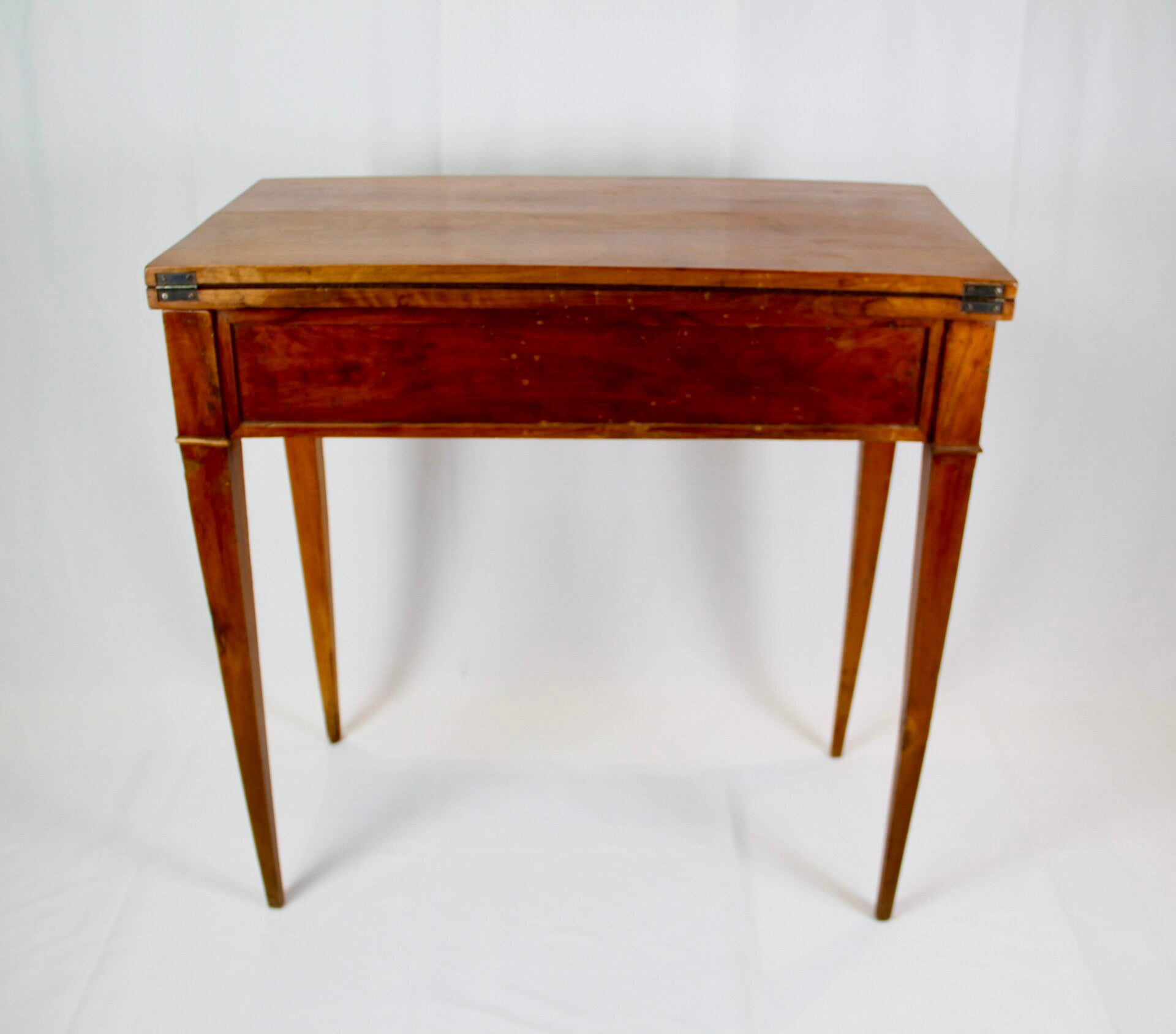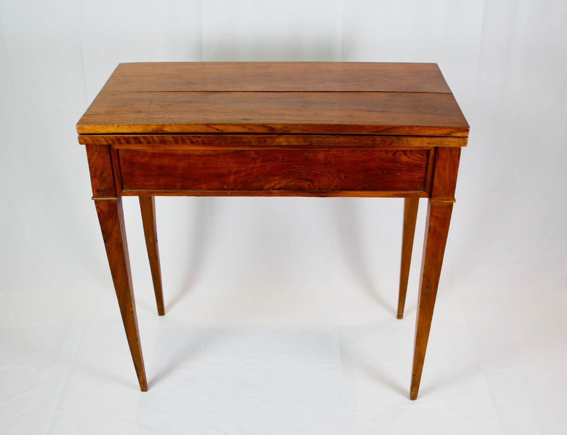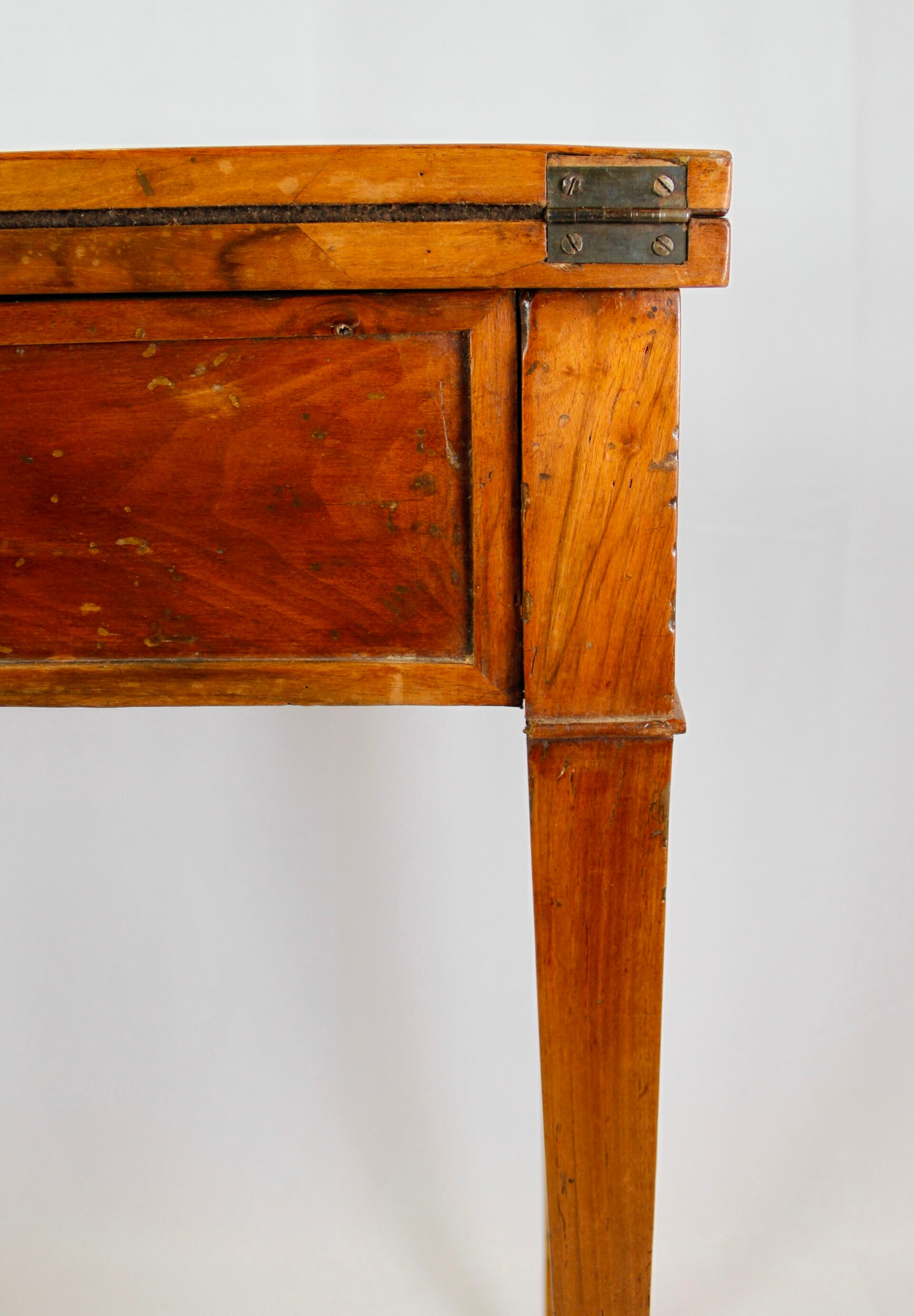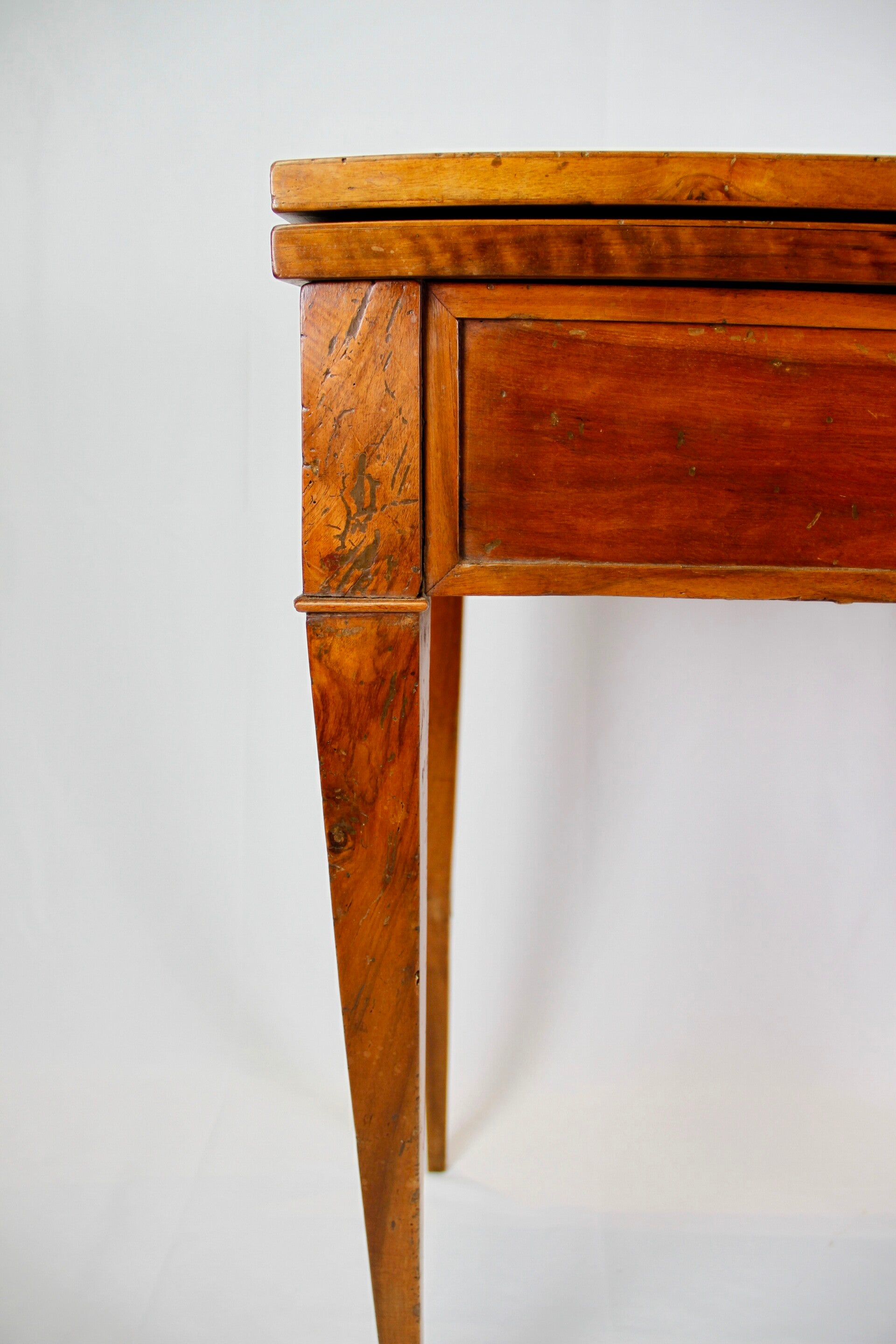 This 19th century French Provincial Directoire style walnut folding game table features a swivel double top, allowing for versatile gaming options. Its ingenious wooden spring locking system ensures stability during play. The felt-lined surface provides a comfortable feel for card games, while tapered legs offer elegance and support. Additionally, its interior storage space adds practicality, keeping gaming accessories neatly organized.