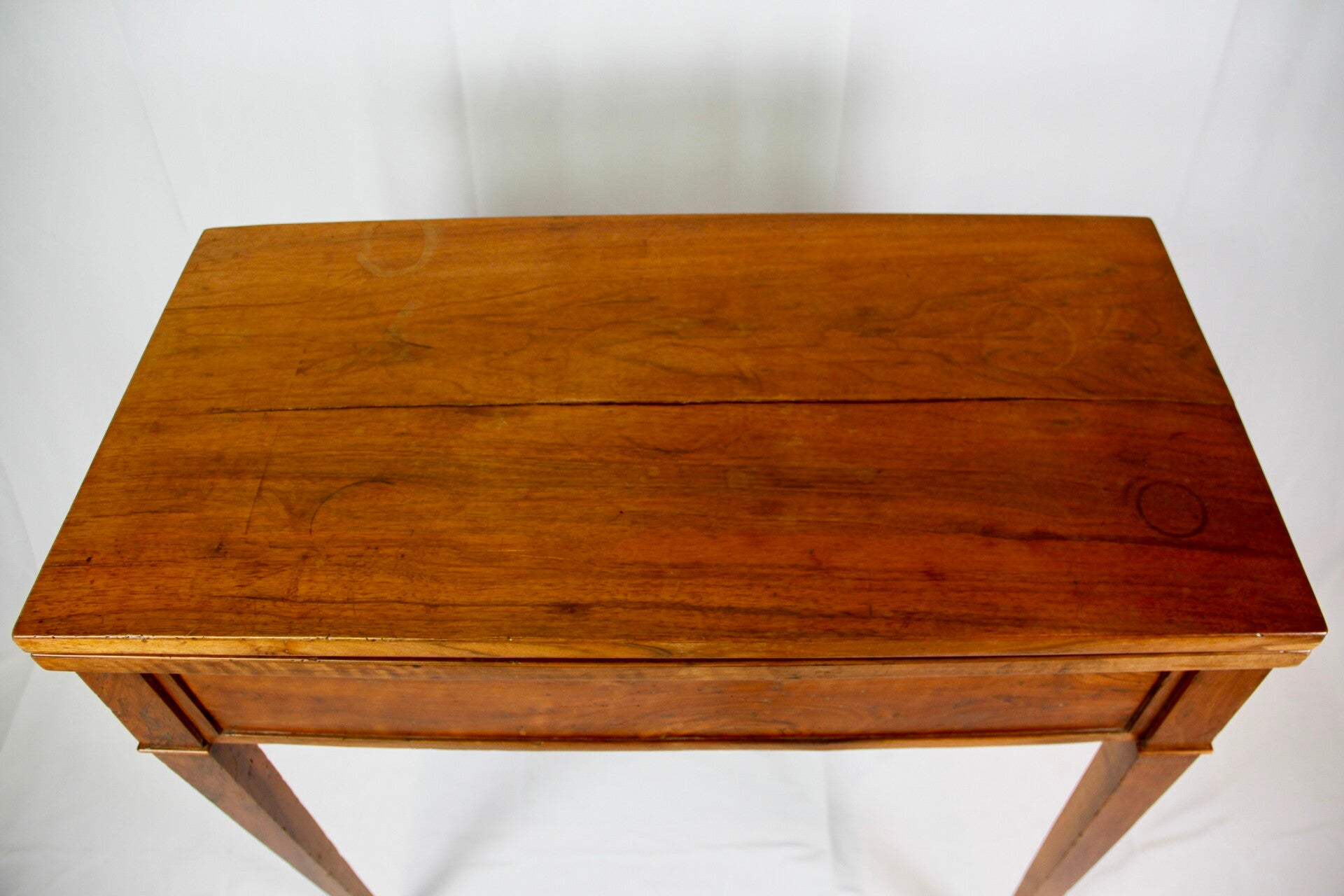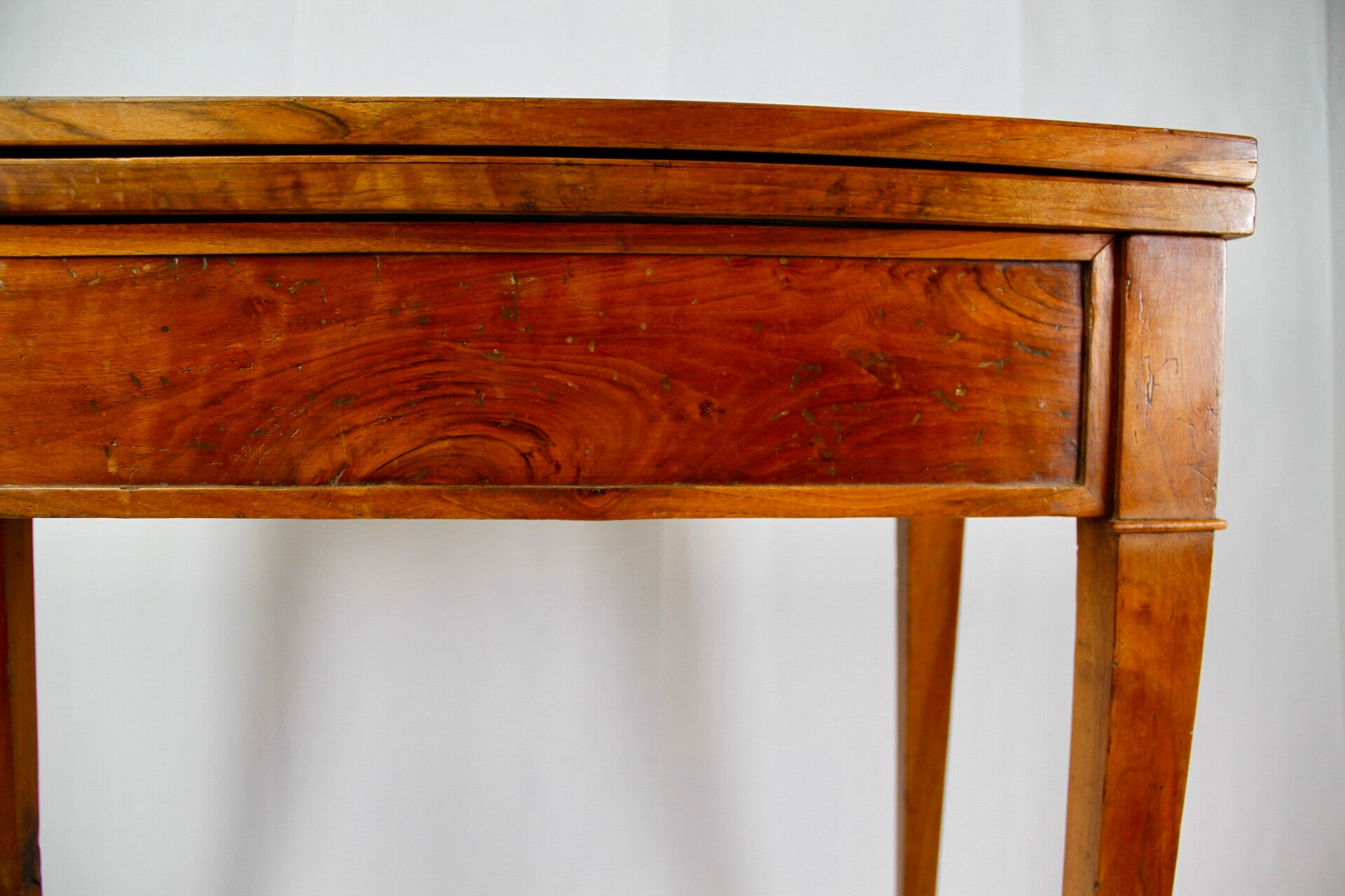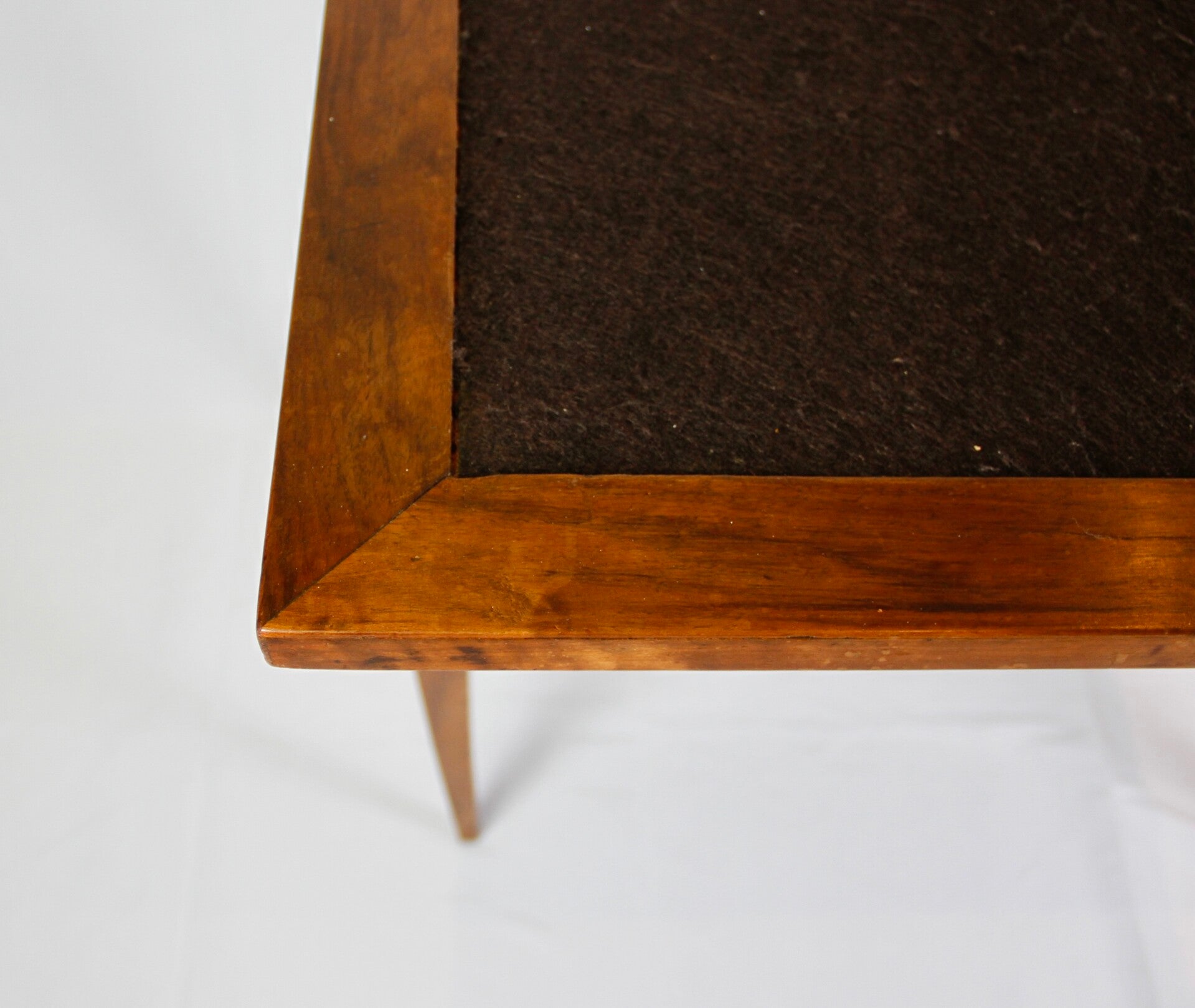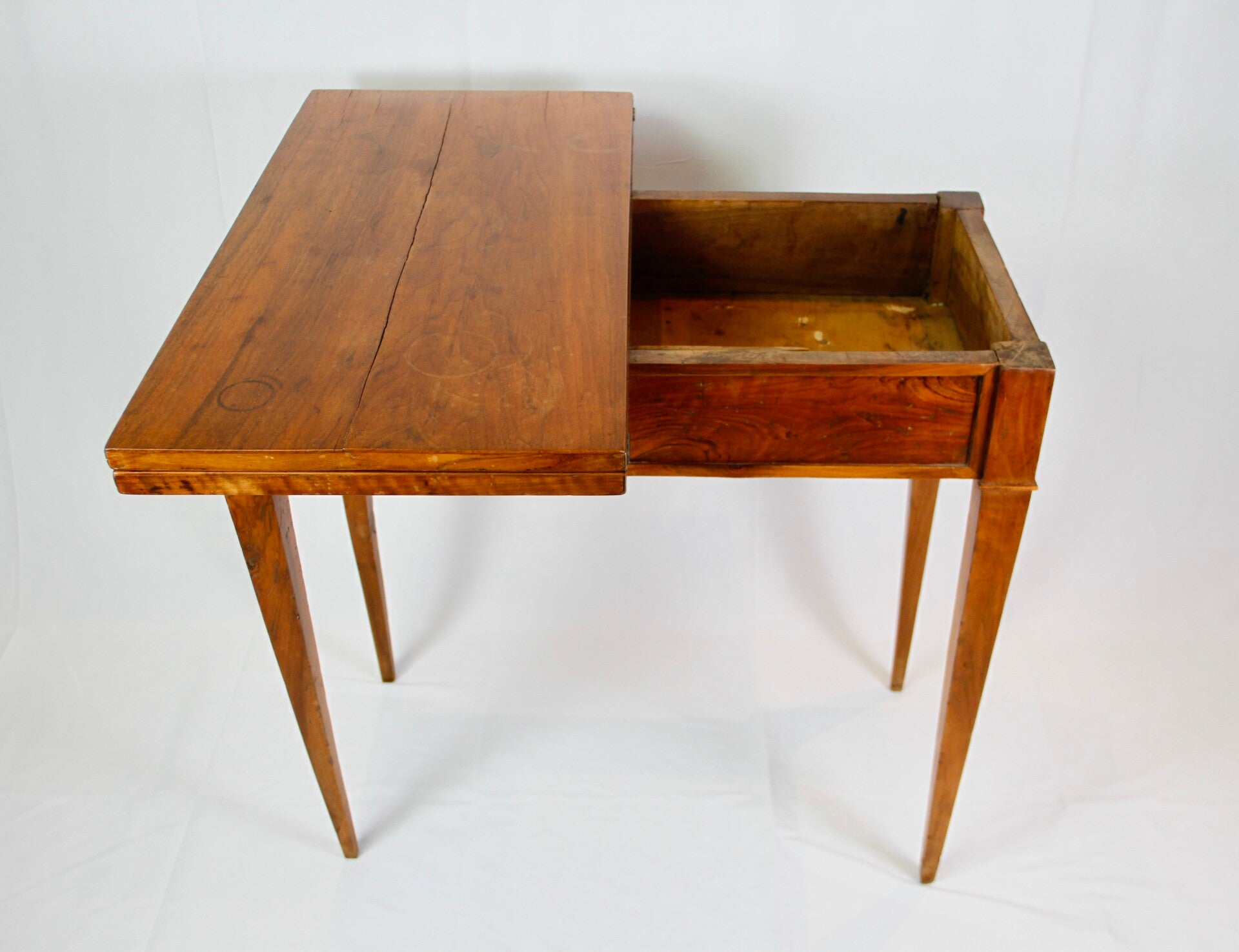 This 19th century French Provincial Directoire style walnut folding game table features a swivel double top, allowing for versatile gaming options. Its ingenious wooden spring locking system ensures stability during play. The felt-lined surface provides a comfortable feel for card games, while tapered legs offer elegance and support. Additionally, its interior storage space adds practicality, keeping gaming accessories neatly organized.