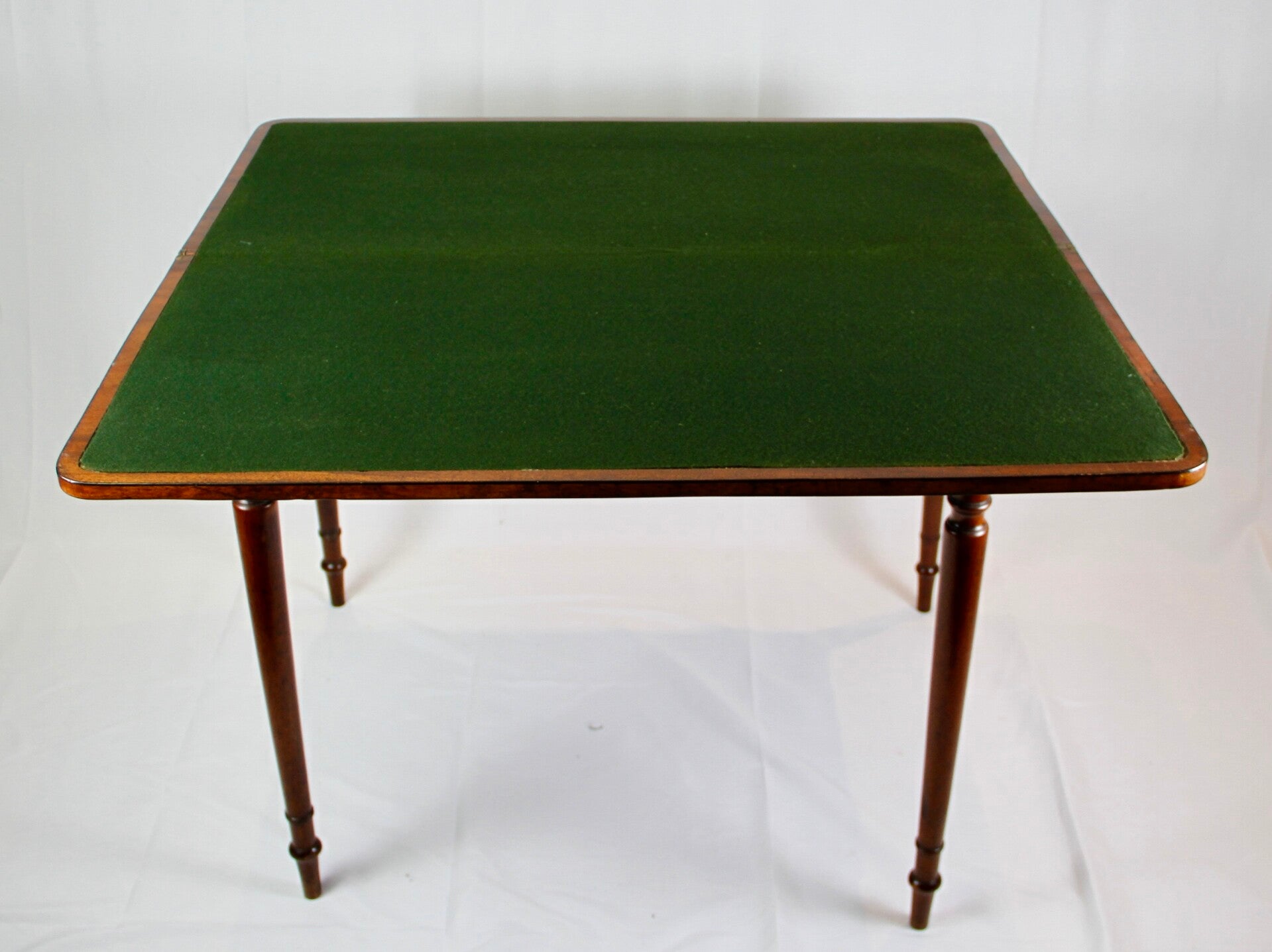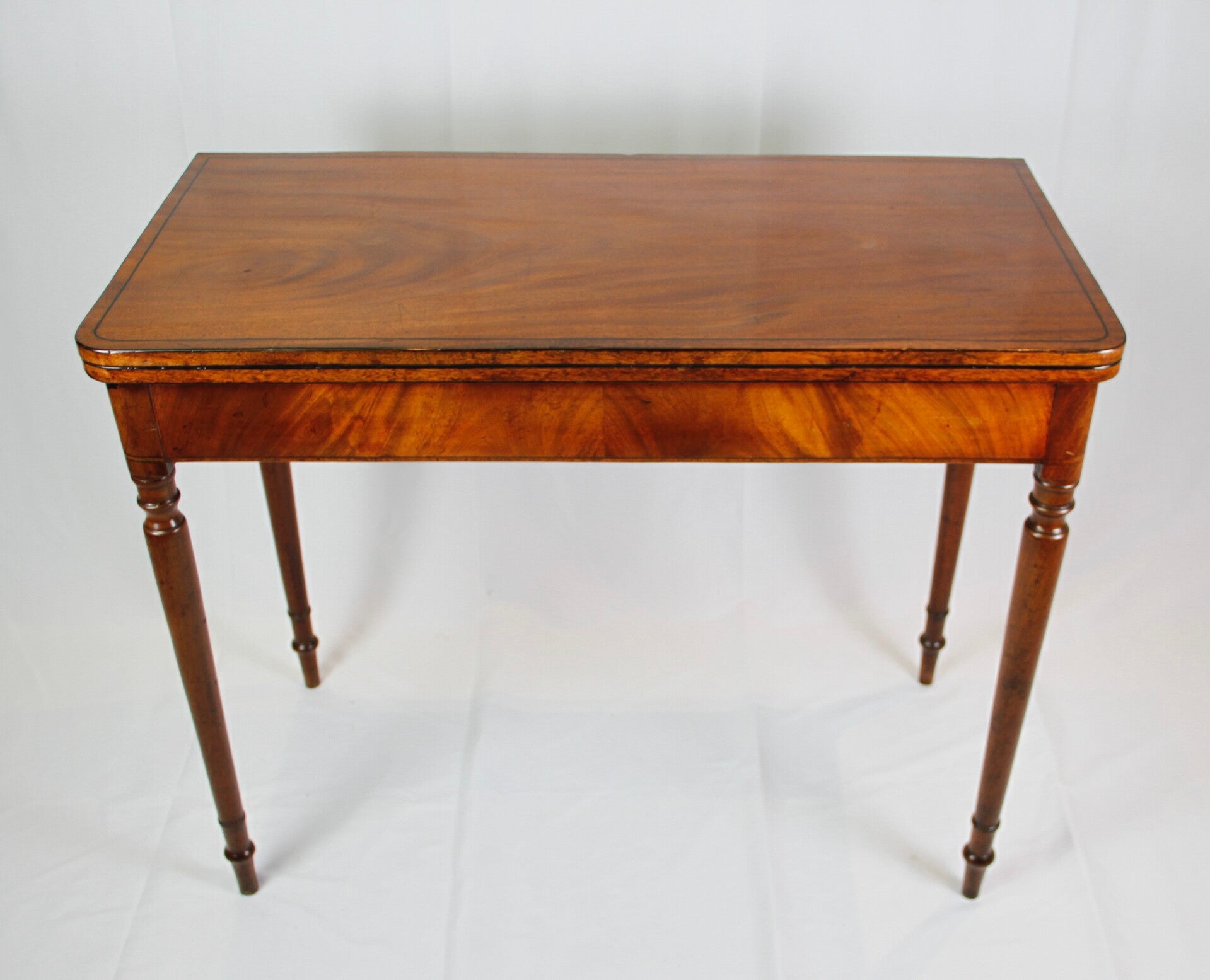 This 19th Century George III mahogany and ebony inlaid gate leg game table epitomizes sophistication and craftsmanship. Its elegant design features delicate ebony inlay work on mahogany wood, complemented by a felt-lined surface for gaming comfort. Supported by gracefully turned legs, this table embodies the timeless charm of the Georgian era.