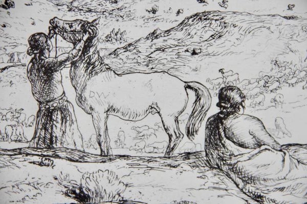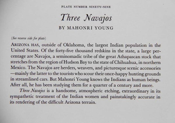 This Mid Century American reproduction print titled, "Three Navajos" by Mahonri Young offers a poignant portrayal of Arizona's Navajo population, second only to Oklahoma in size within the United States. Among the state's forty-five thousand Native Americans, a significant portion are Navajos, part of the vast Athapascan tribe spanning from Hudson Bay to northern Mexico. Traditionally herders and weavers, they add picturesque allure to the landscape, often seen by tourists traversing their ancestral lands in modern cars. However, Mahonri Young transcends mere scenic depiction, presenting the Navajos as individuals. With over twenty-five years of study, Young's etching captures the essence of Navajo women with empathy and accuracy amidst Arizona's challenging terrain, creating a striking and evocative work of art.