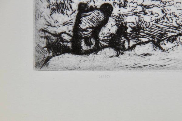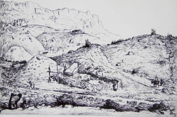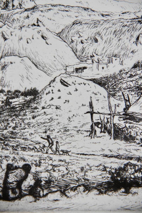 This mid-century American reproduction print, titled 'Walpi in Sunlight' by Mahonri Young, reflects the artist's dynamic and diverse career. Born in Salt Lake City, Utah, in 1877, Young, a grandson of Mormon leader Brigham Young, initially honed his craft in the West, working with clay and adobe. He later pursued formal training in painting at the Art Students' League in New York and the Académie Julian in Paris.In 1912, Young embarked on his renowned studies of the Navajo Indians, capturing their essence through bronze bas-reliefs, etchings, and pastels. Returning to New York, he delved into depicting the city's laboring classes, showcasing their vitality in bronze sculptures and energetic etchings of New York construction sites. As a respected instructor at the Art Students' League and the American School of Sculpture, Young continues to inspire budding artists.'Walpi in Sunlight' exemplifies Young's meticulous craftsmanship and deep connection to landscape. Created over a decade, it portrays a Navajo settlement in northern Arizona, showcasing Young's profound understanding of natural beauty and his mastery of traditional techniques.