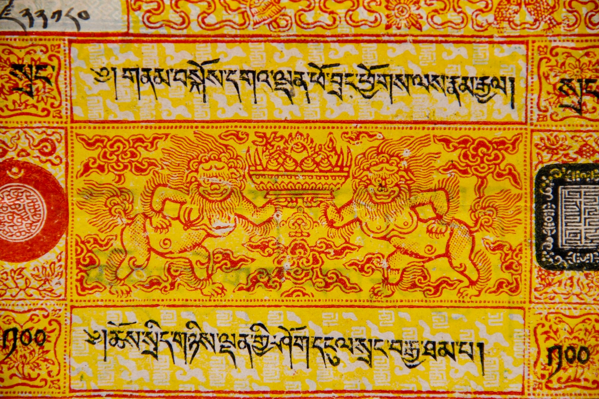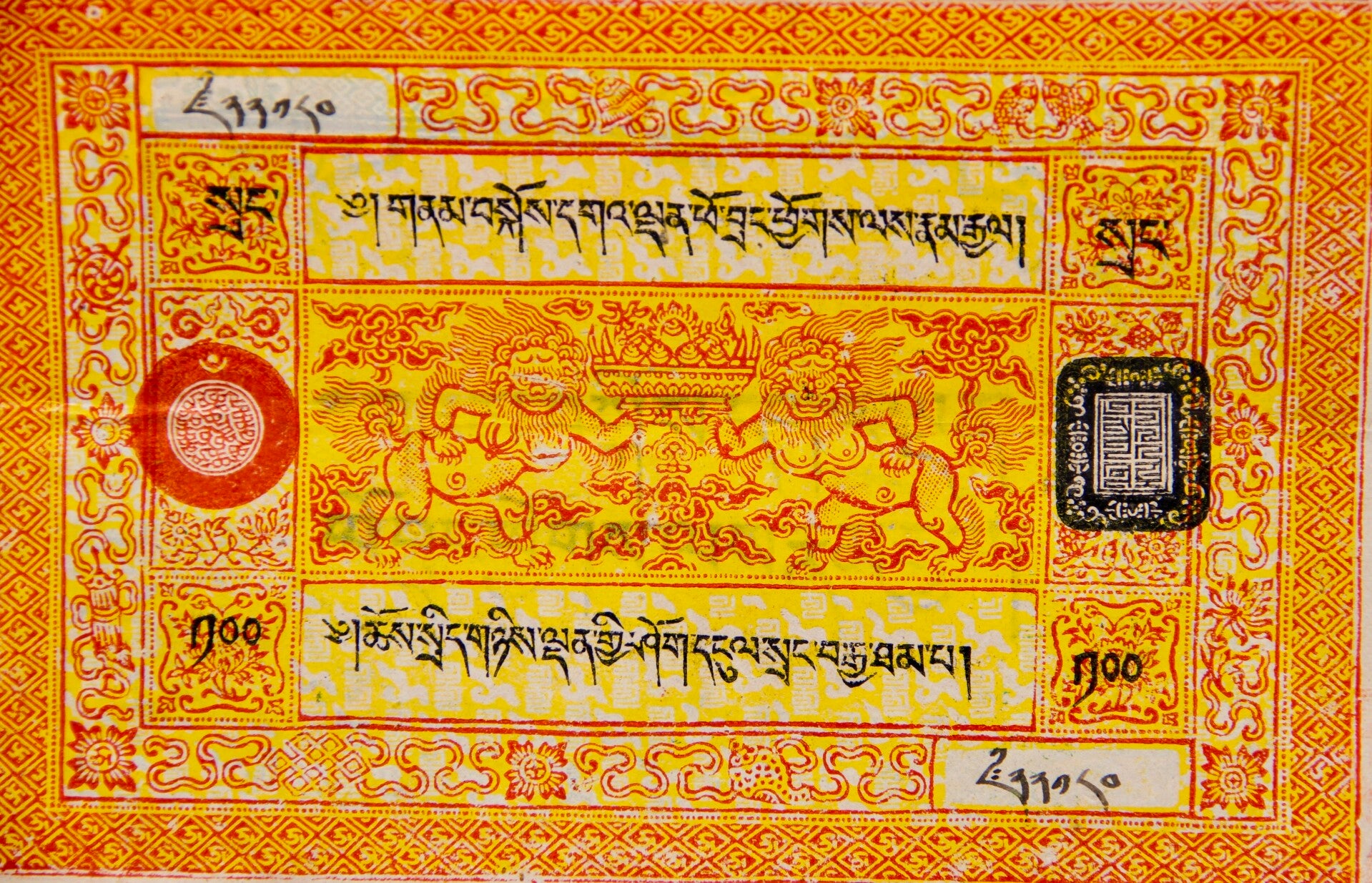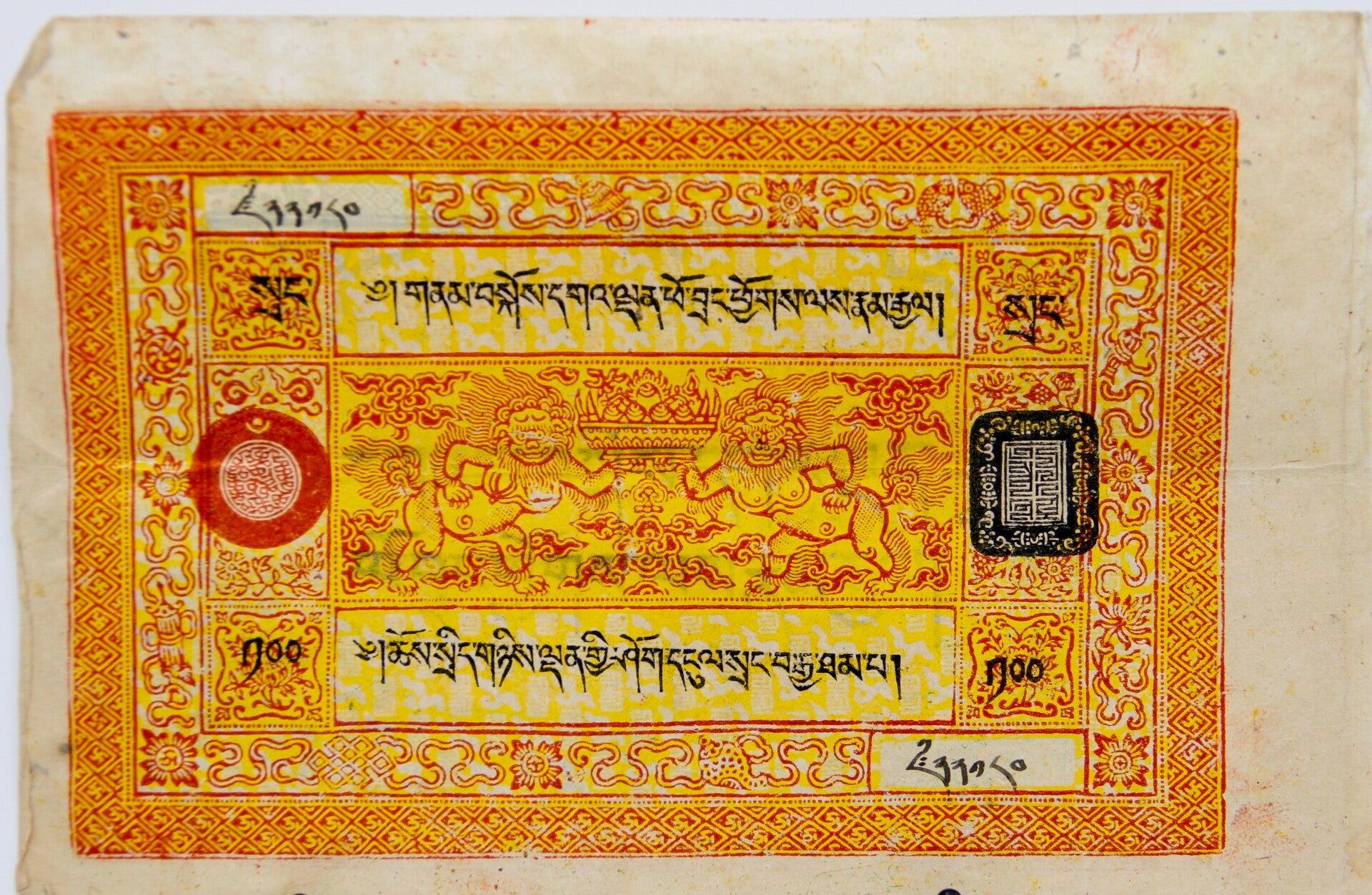 For sale is a rare Tibetan 100 Srang currency note from independent Tibet, sourced from the esteemed coffers of a prominent Tibetan merchant family. This artifact bears historical significance, showcasing the unique monetary system of pre-Chinese occupation Tibet. It offers a tangible connection to Tibet's rich cultural and economic heritage. Serious collectors and enthusiasts alike will appreciate the opportunity to add this prized piece to their collections.