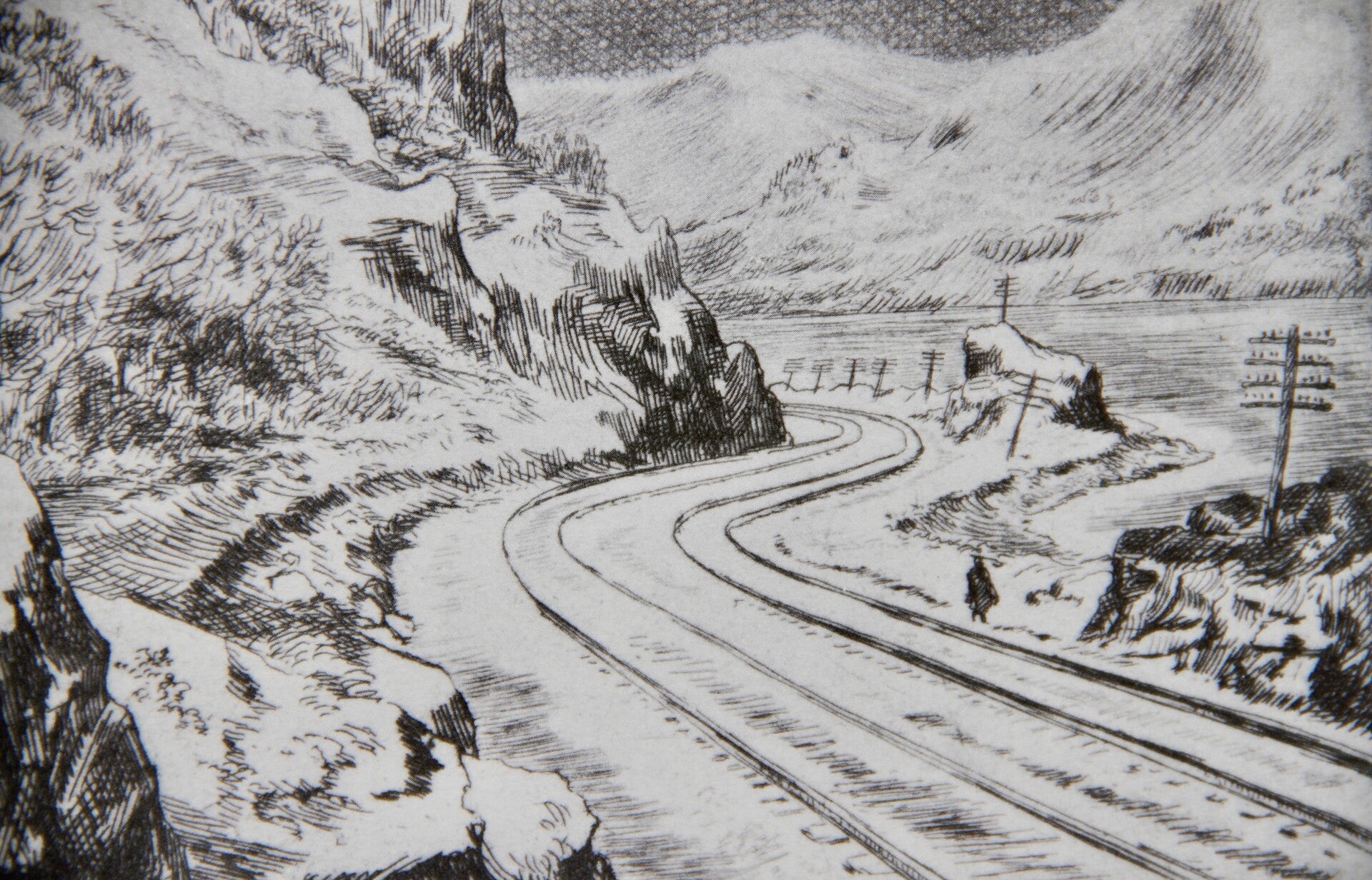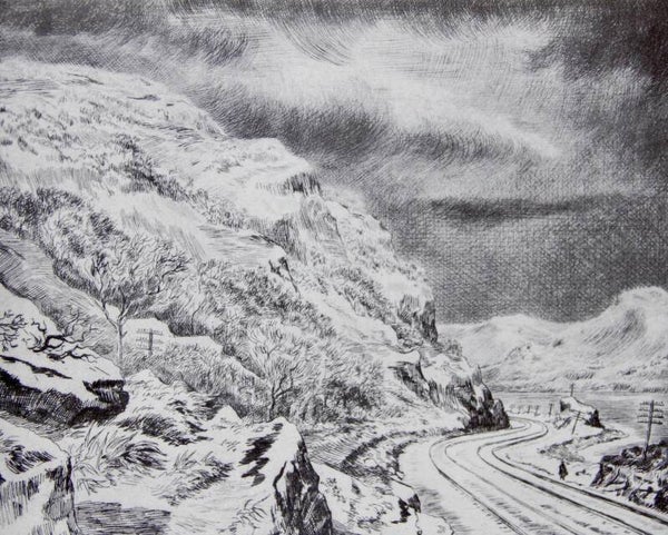 The cold, bleak beauty of the river and mountains under a heavy fall of snow has proved a very grateful subject for his etching needle: the thrilling quality of the country has been communicated to the plate.
