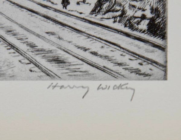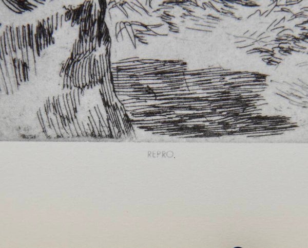 This Mid century American reproduction print titled “Hudson Highlands Under Snow” is by Harry Wickey. In 1929, the artist moved from New York City to Cornwall Landing, about fifty miles up the Hudson. Here his latent interest in landscape began to assert itself. He perched his studio on the riverbank, and was afforded splendid opportunities for studying the character of the river and mountains in all varieties of weather. For four years, from 1930 to 1934, Wickey did little else than concentrate on these ever fascinating views, studying rocky formation and mountain contour. A whole series of plates was devoted to this subject matter.