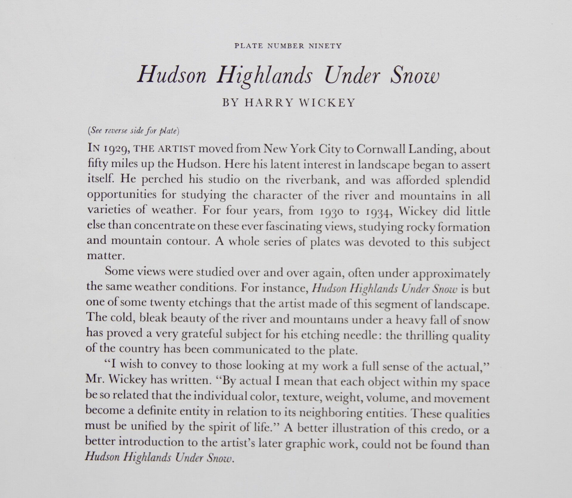 "I wish to convey to those looking at my work a full sense of the actual," Mr. Wickey has written. "By actual I mean that each object within my space be so related that the individual color, texture, weight, volume, and movement become a definite entity in relation to its neighboring entities. These qualities must be unified by the spirit of life." A better illustration of this credo, or a better introduction to the artist's later graphic work, could not be found than “Hudson Highlands Under Snow.”