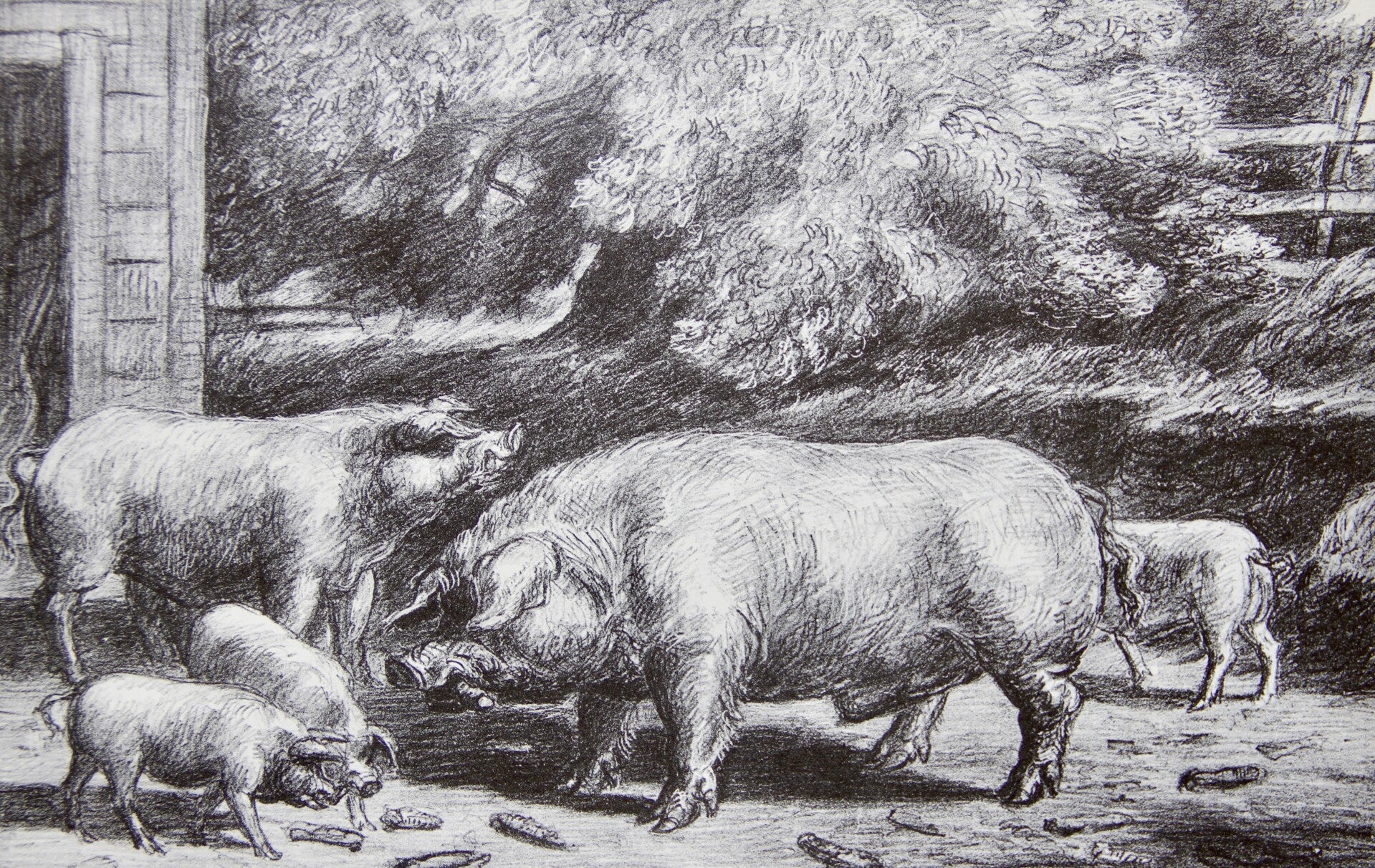 Mid Century American reproduction print “ Hogs near a Corncrib”