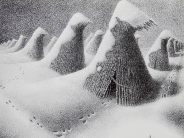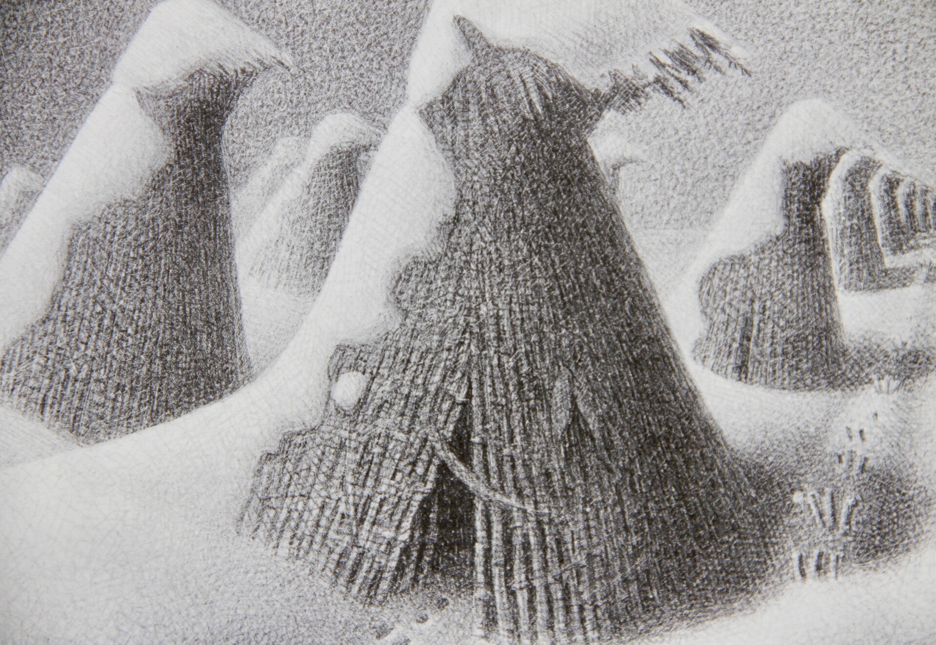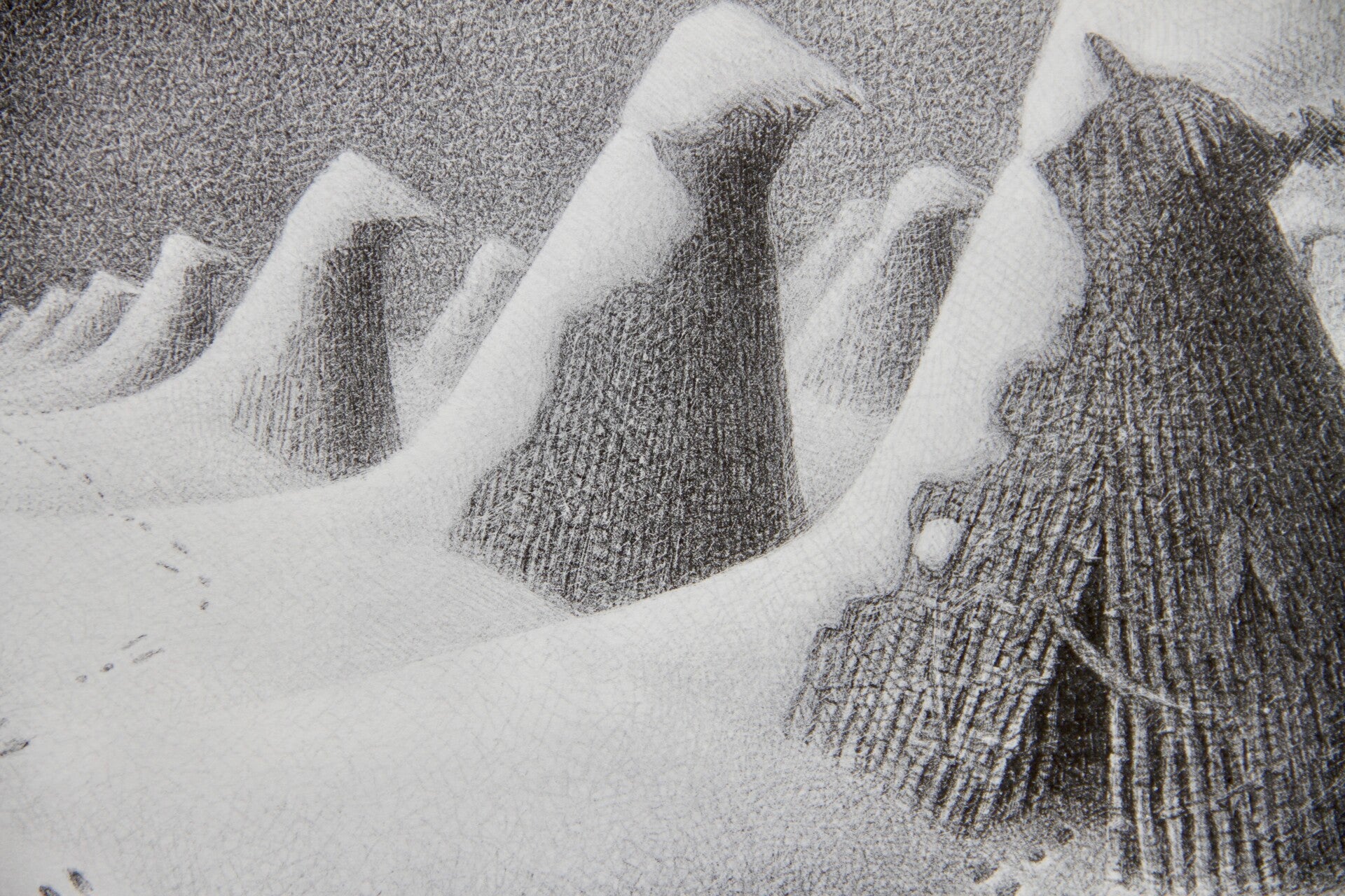 “January”, a snow scene with stacked-up cornshocks, shows Wood's strong interest in recurrent pattern-an interest that is almost Oriental in its intensity.