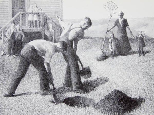 Grant Wood caught the solemnity of this modern Ceralia in his Tree-Planting Group. The importance of forestation is inculcated in the schools of the Middle West through thousands of annual rites such as we see in this lithograph. The composition has humor, a rich appreciation of local types, and yet a sincere reverence and real understanding of the seriousness of the occasion. The schoolteacher, flanked by two small girls, advances with the sapling. Two of the older boys are busy preparing its bed, one of them wielding the spade. The careful haircuts of these solemn young chaps constitute a characteristic Grant Wood touch of observation.