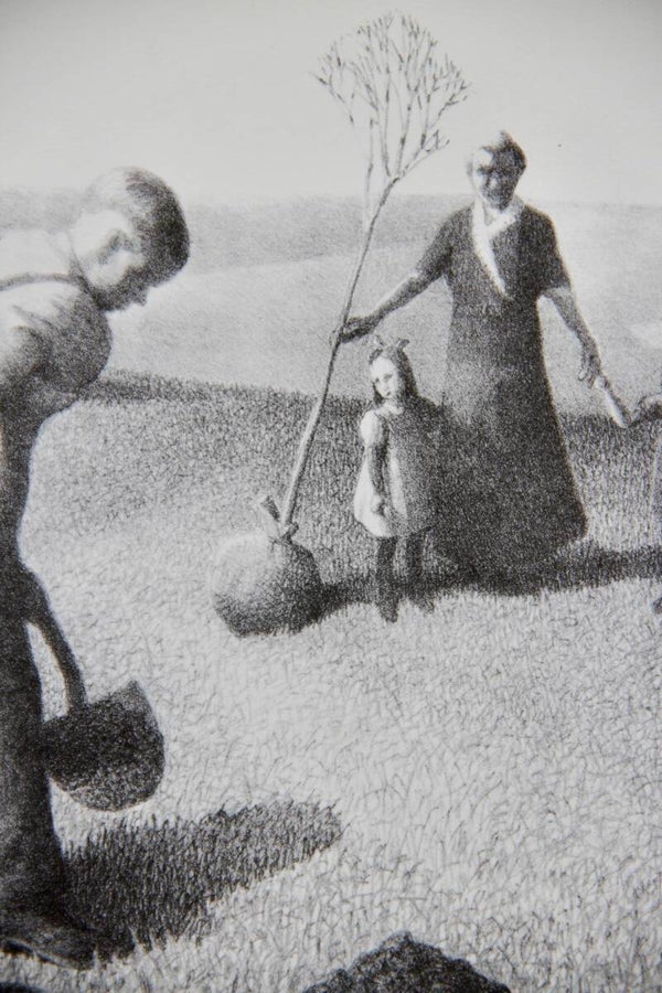 This mid century American reproduction print titled “Tree-Planting Group” is by Grant Wood.