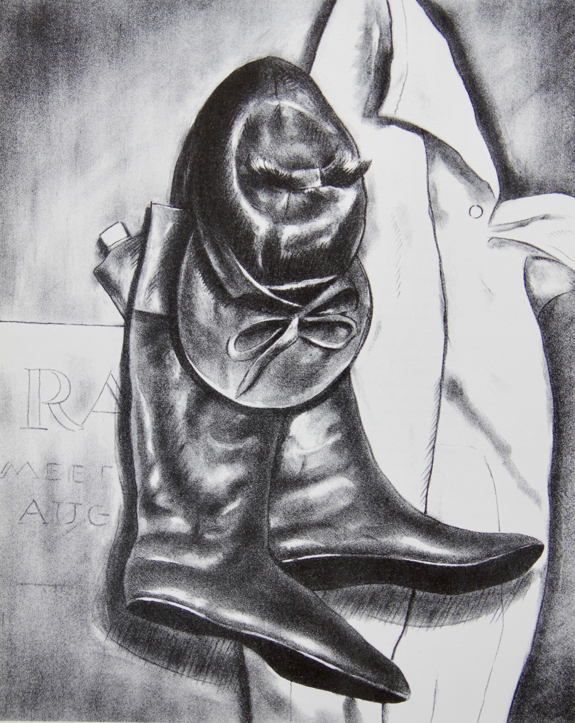 Townsend made the drawing for fockey Clothes during a county fair. The owner of the boots and pants had won two races in the day's card, and the artist made the drawing after the jockey had hung them up in his stall.