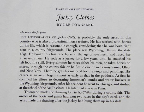 This mid century American reproduction print titled “Jockey Clothes” by Lee Townsend is probably the only artist in the US who was also a professional horse trainer. He had worked with horses all his life, which is reasonable enough, considering that he was born right next to a county fairgrounds. The place was Wyoming, Illinois, the date 1895. He bought his first race horse at the age of seventeen, and raced her at near-by fairs. He rode as a jockey for a few years, until he smashed his left foot in a spill. Every summer he raced either his own, or took horses on shares, through the county-fair or half-mile circuit in Pennsylvania, Ohio, and New York. There he got his material for drawings and paintings. His career as an artist began almost as early as that in the paddock. At first he confined his efforts to decorating horsemen's trunks and water buckets at the Wyoming fairgrounds. After his accident he went to Chicago, and studied at the school of the Art Institute. He later had a year in Paris.