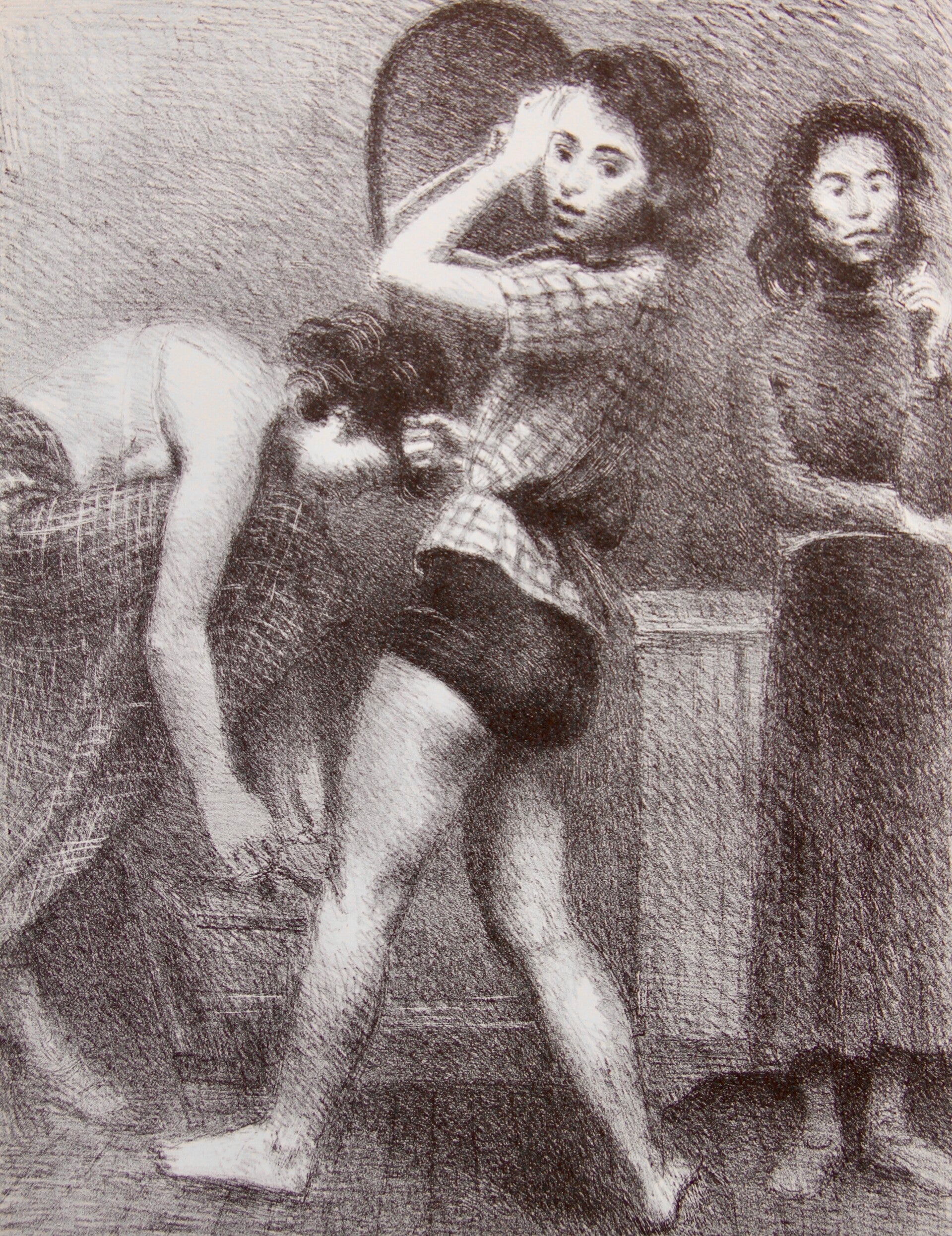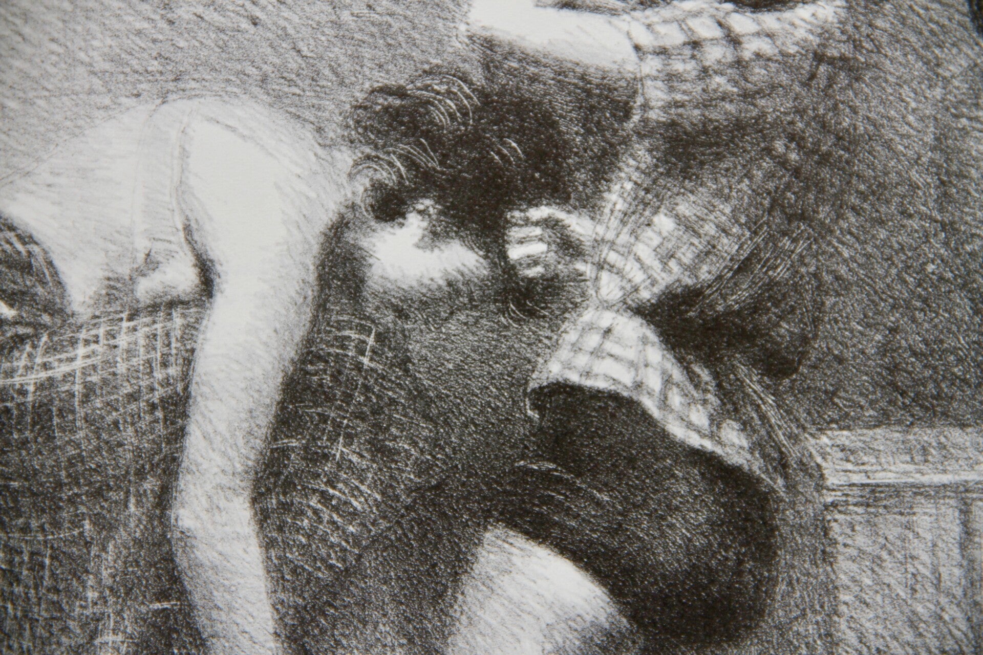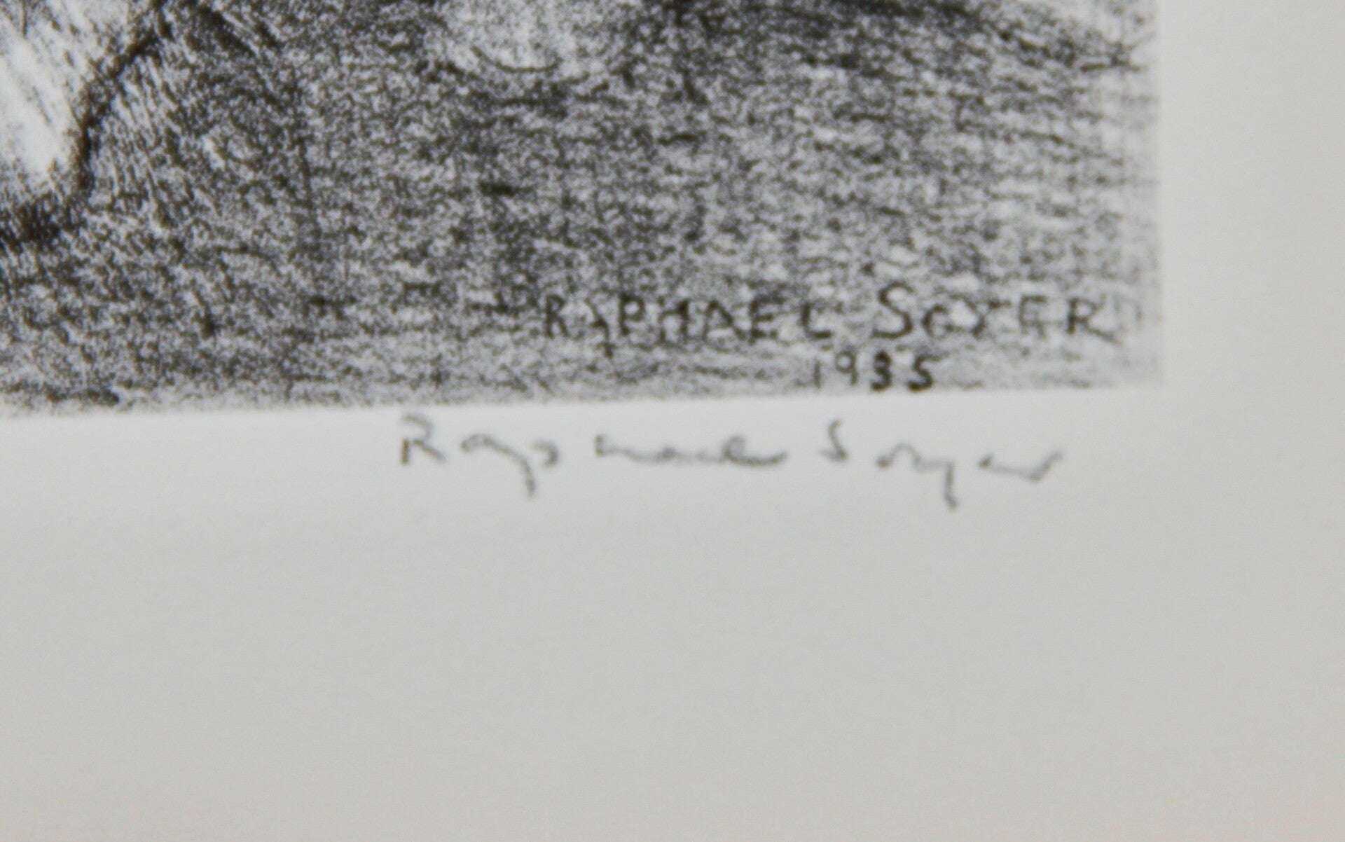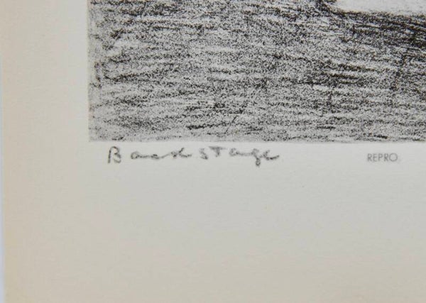 This Mid Century American reproduction print titled “Backstage” is by Raphael Soyer who came to the United States when he was ten years old, having been born in Tombov, Russia, in 1899. The lad was gifted, and when he was old enough went to the Art Students' League for instruction, meanwhile supporting himself by selling newspapers and working in factories. Recognition came to him early, and a number of his paintings hung in important American galleries, including the Metropolitan and Whitney, in New York, as well as in various private collections. His two brothers, Isaac and Moses, were also talented artists. Soyer illustrated phases of New York life, and maintained his studio in the heart of the colorful Fourteenth Street district. “Backstage” is one of several lithographs Soyer had devoted to the stage. Though a pleasing enough composition, and interesting for the artist's dramatic disposition of light and shadow, it is notable primarily for the intense emotion that permeates it.