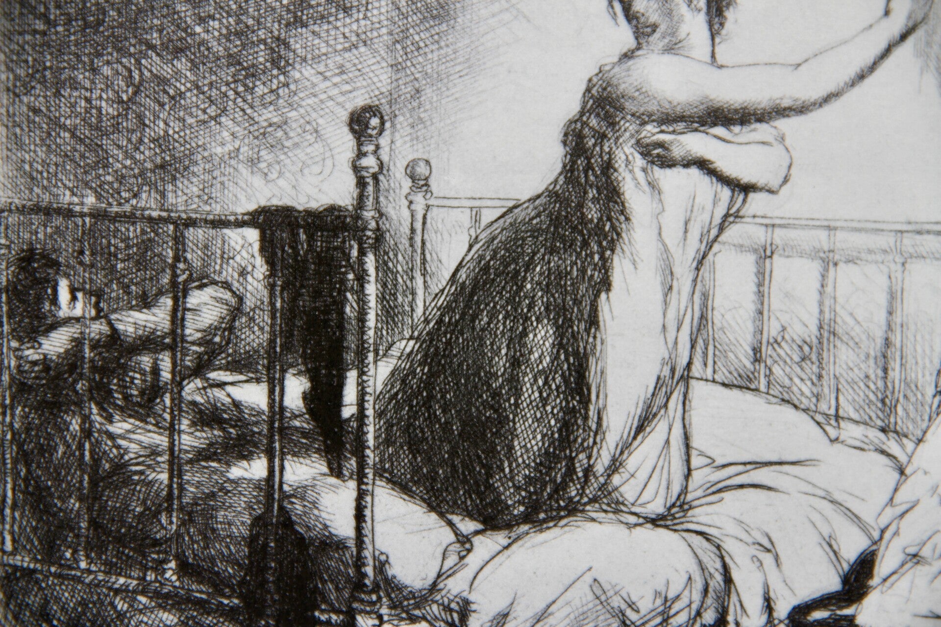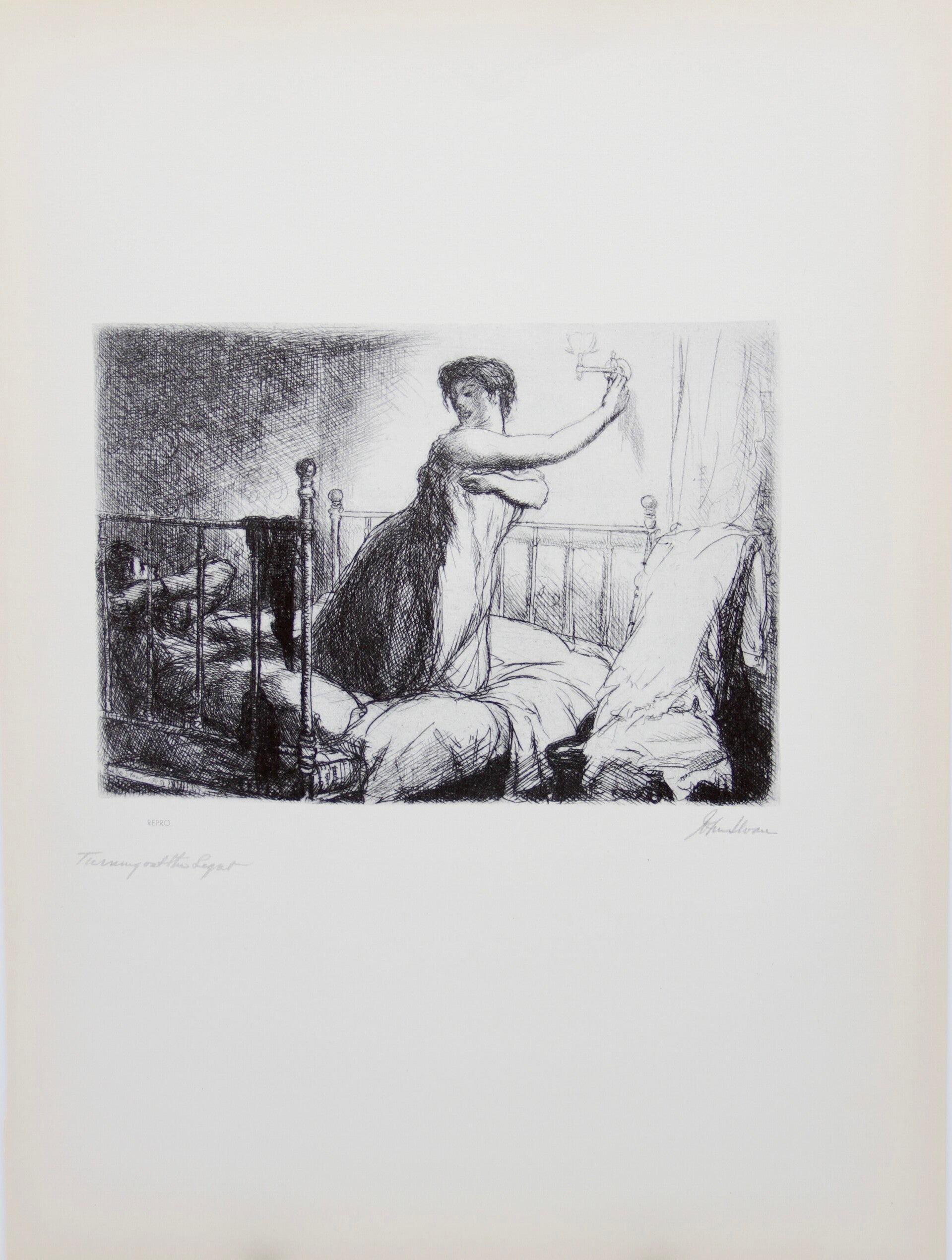 “Turning Out the Light” is a typical scene from the homely drama of a great city's life. As John Sloan himself said of one of his early paintings, Three A.M., “Night vigils at the back window of a Twenty-third Street studio were rewarded by motifs of this sort; many of them were used in my etchings." Like the same picture, Turning Out the Light "is redolent with the atmosphere of a poor, back, gas-lit room." Furthermore, it is one of Sloan's most impressively designed etchings, with the balance of blacks and whites finely calculated.